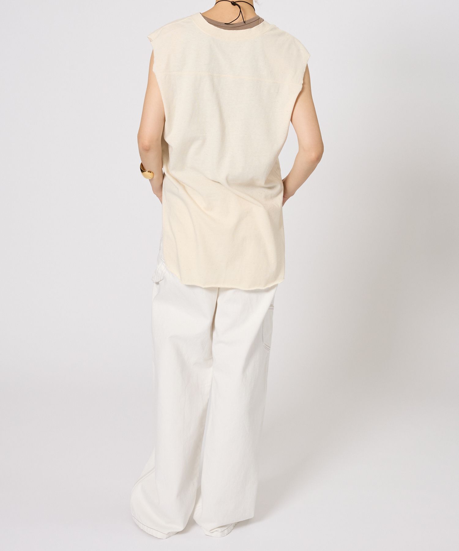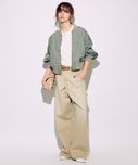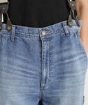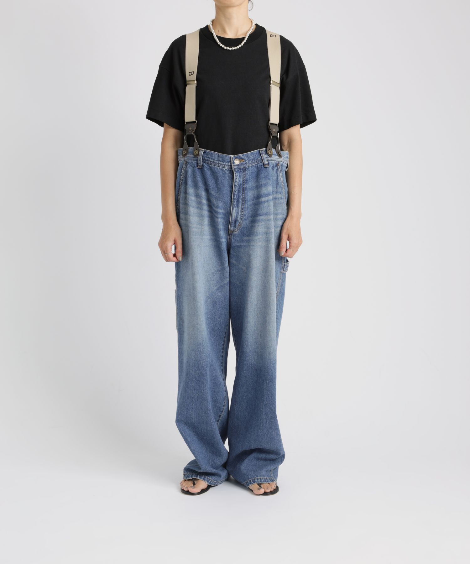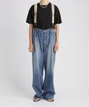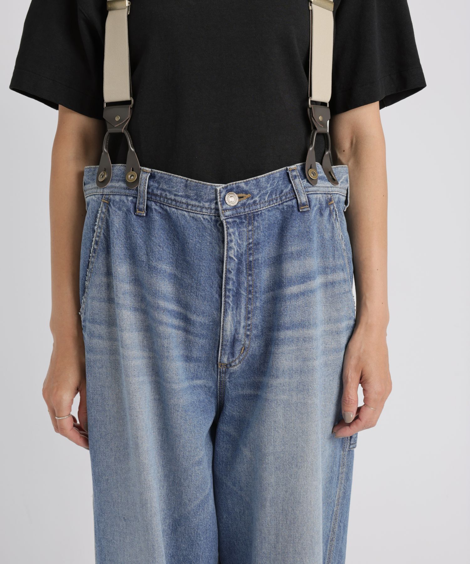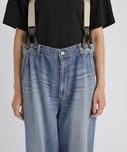 普通に閉めるとややウエスト大きめですが、あえてブカブカした感じで履いた方がサスペンダーとの相性が良いです◎ Tシャツやシャツなど薄手のトップスだけでなく、スウェットやニットなど肉のあるアイテムもデニムインして着られそうなので、着回しの幅が広がりそう。 -