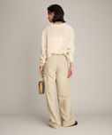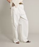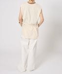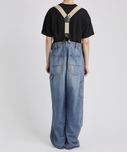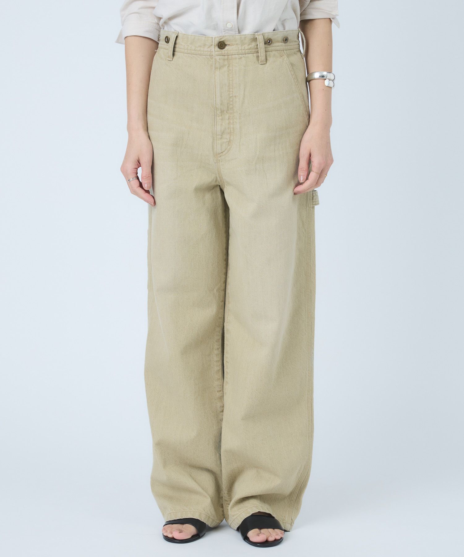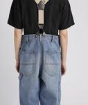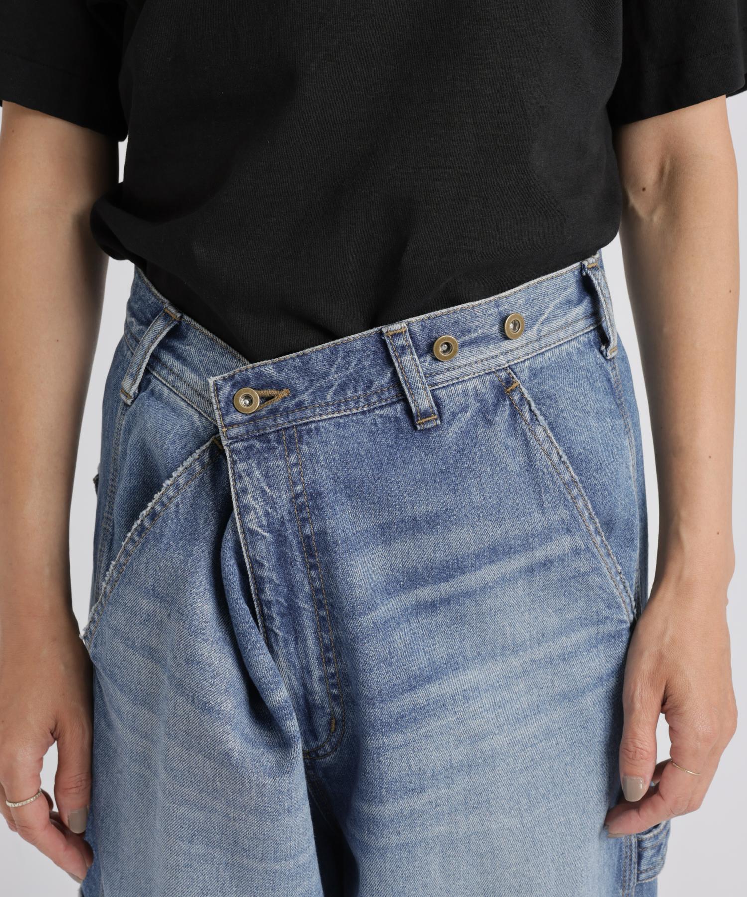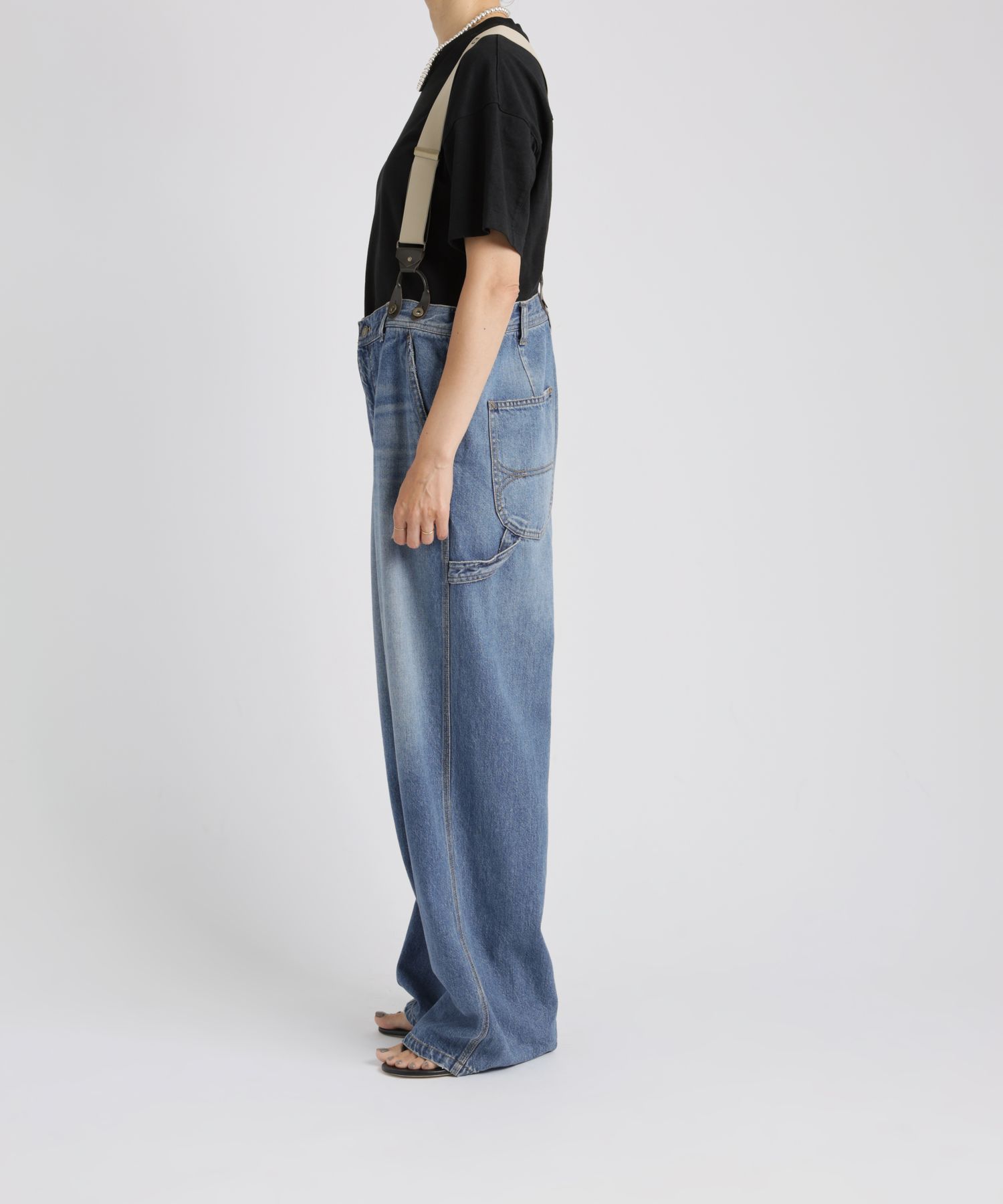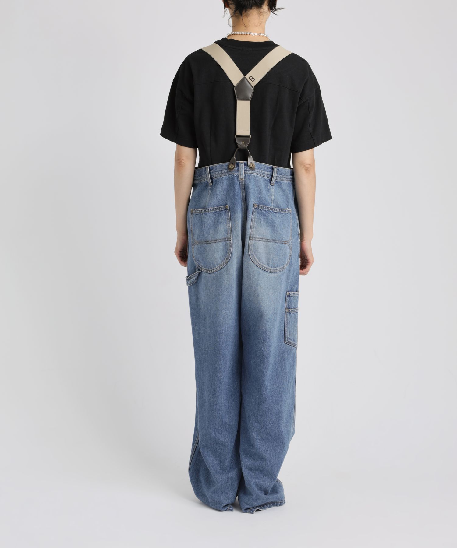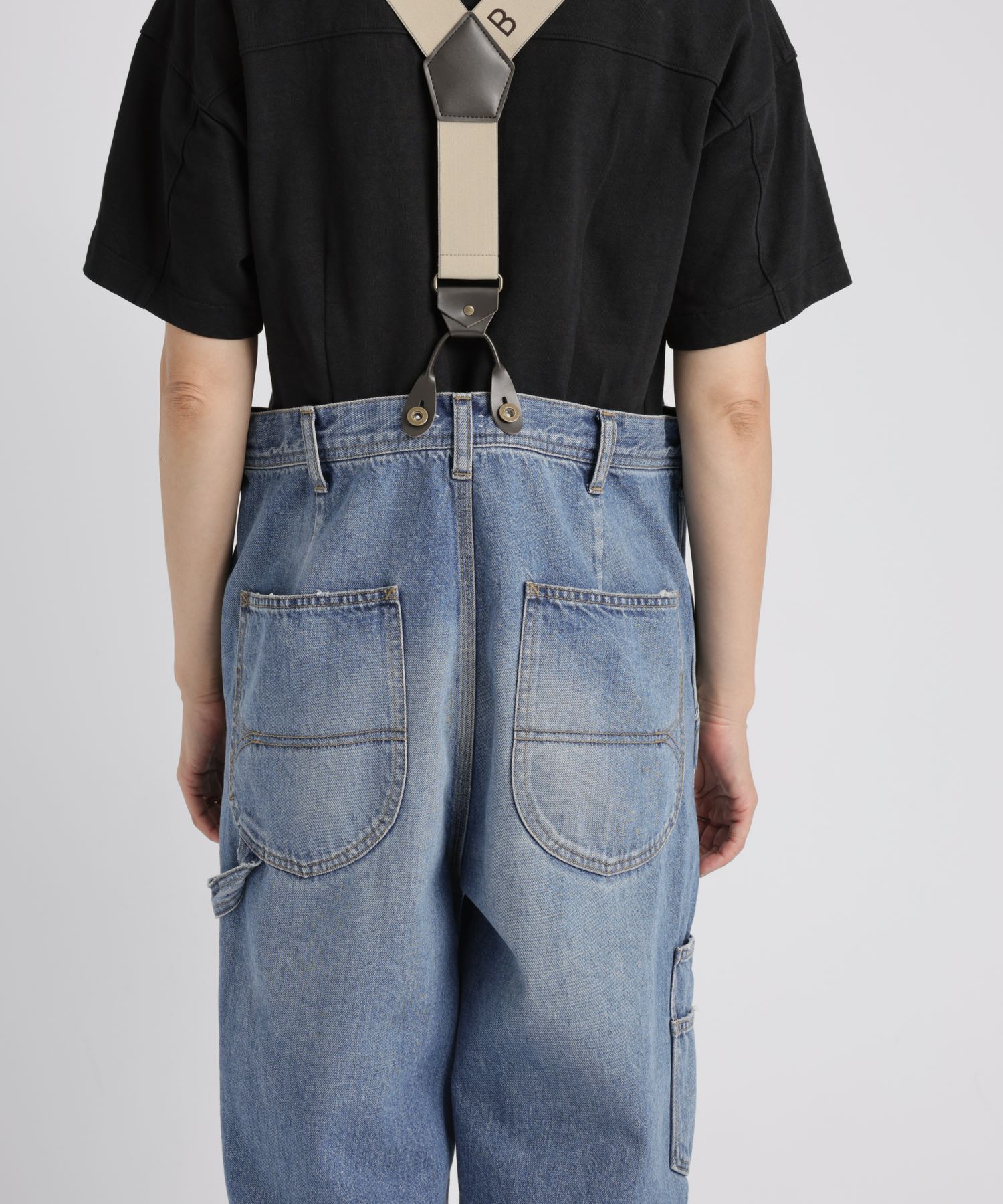 ペインターデイテールのパンツをオーバーサイズに仕上げたデザイン。サスペンダーのつけられる釦もあり、ブランドオリジナルのサスペンダーをつけ着用頂けます。サスペンダー釦を利用し、前打ち合わせを深くアシンメトリーにした着用も素敵です。