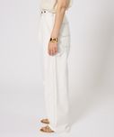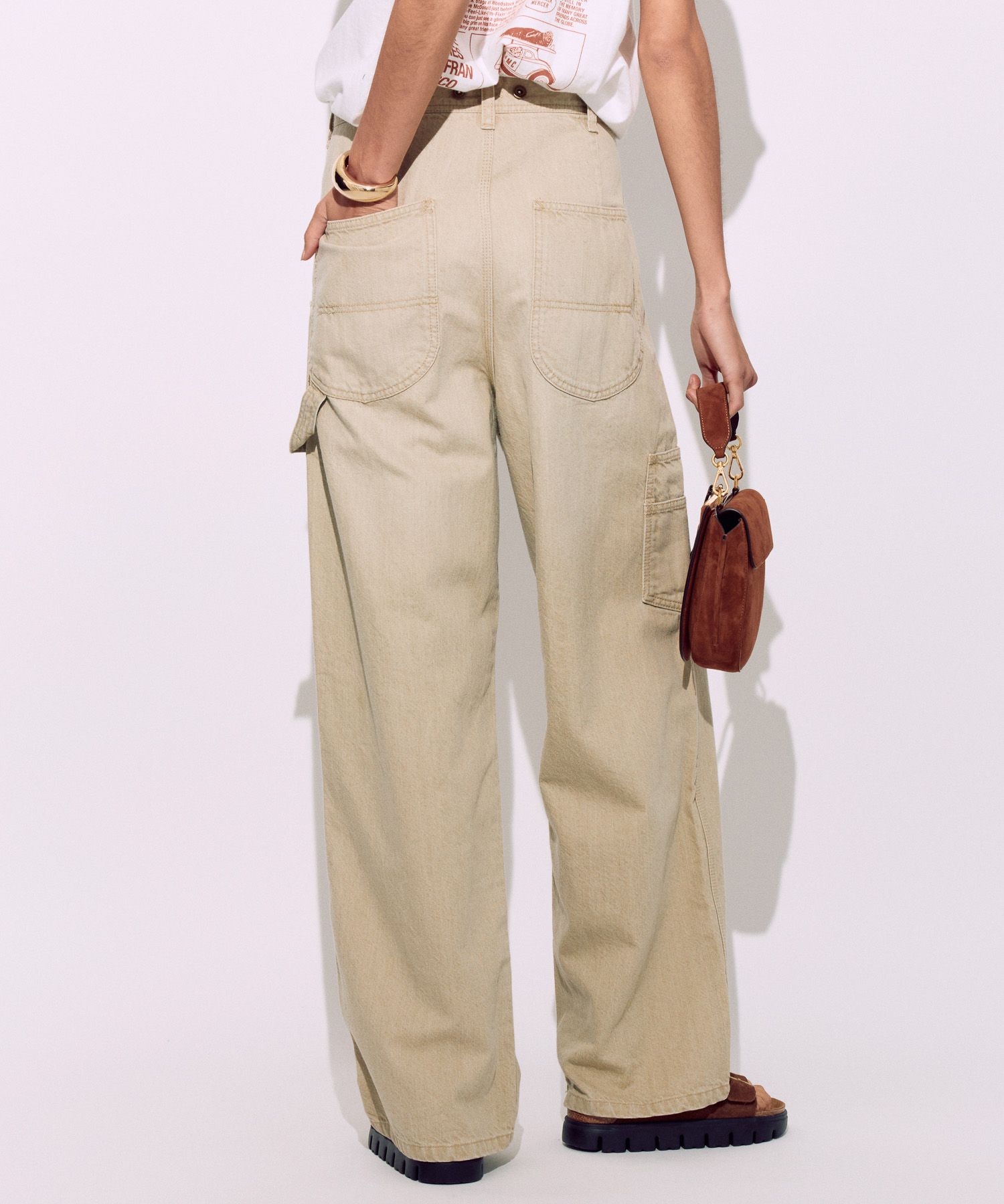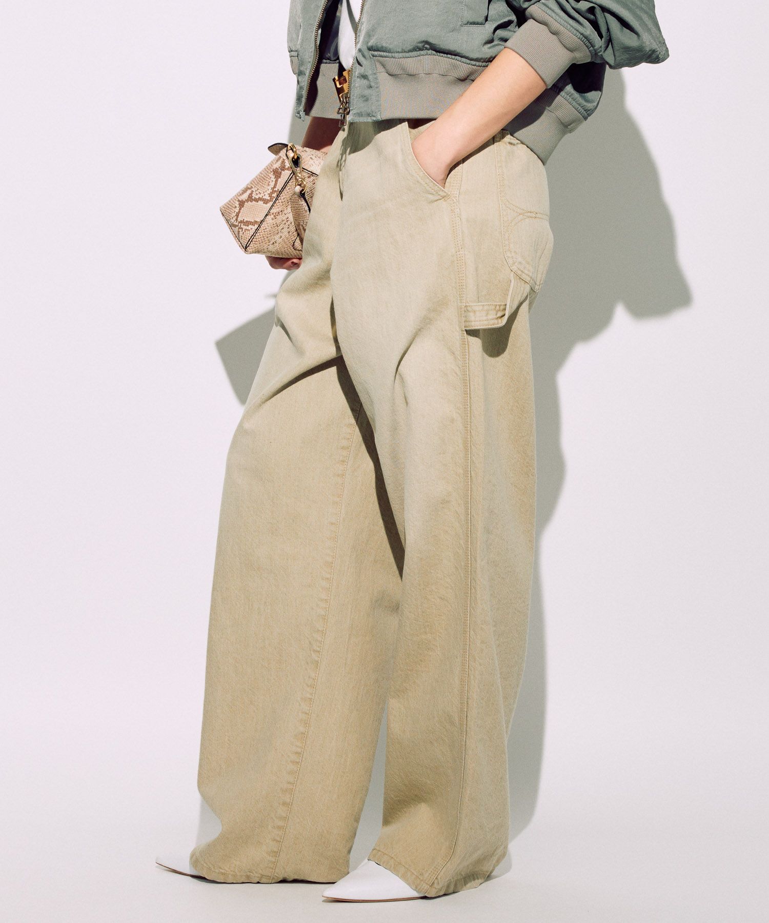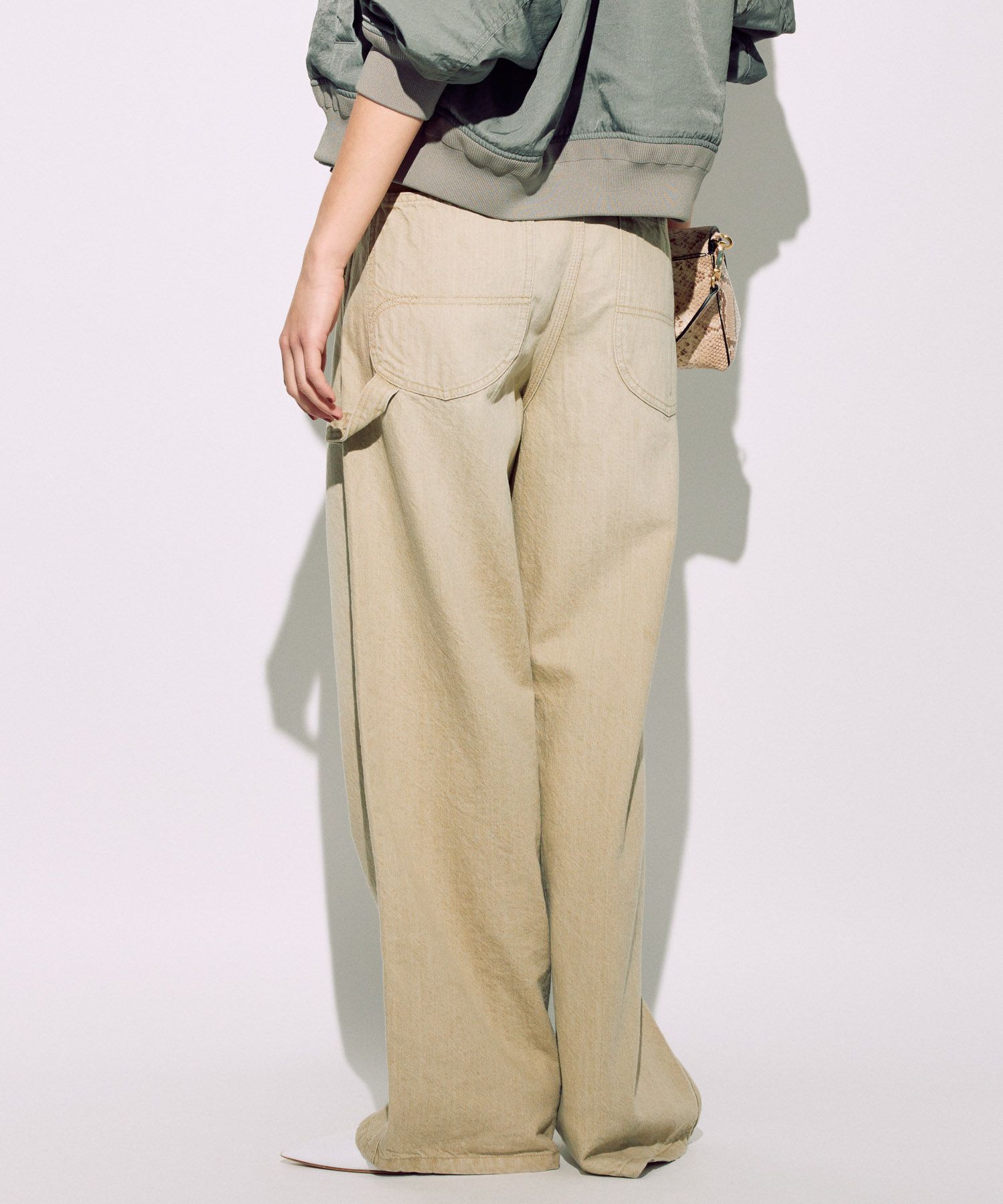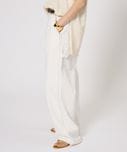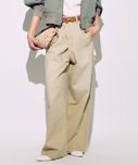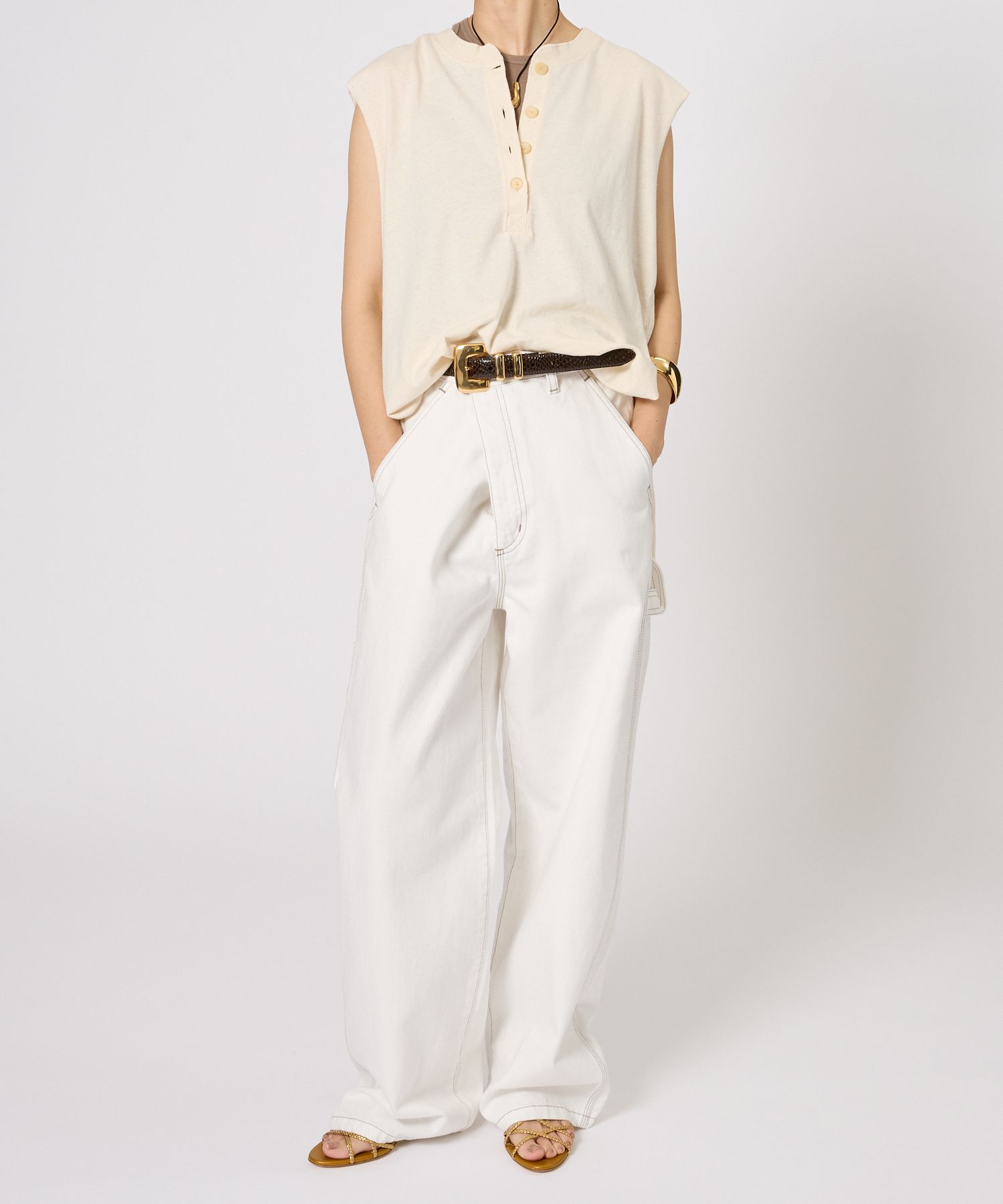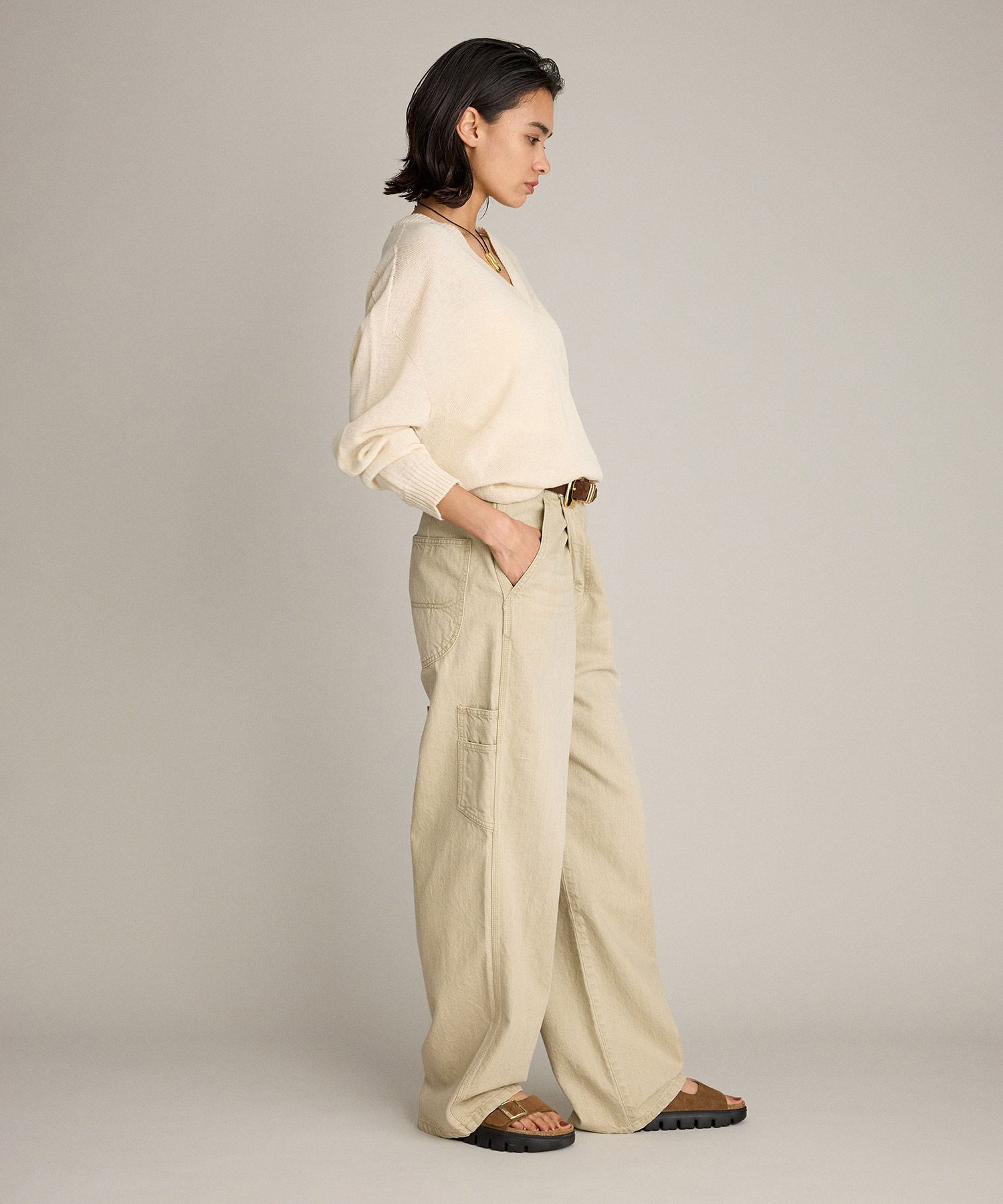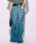 サスペに頼らず腰骨に乗せて履く感じです。生地の落ち感でワイドに見えすぎずスッキリ着用できます。ちょっと普通に見えすぎちゃうかな。。 -