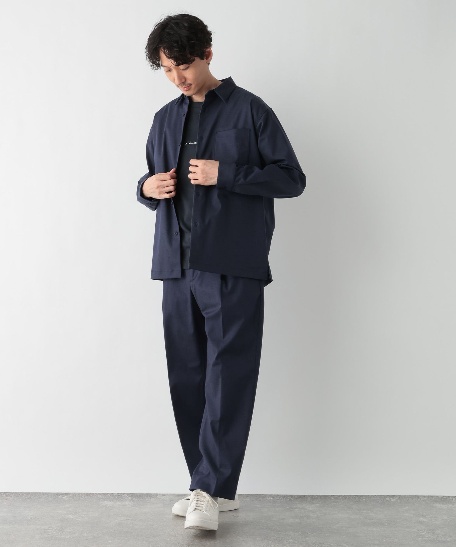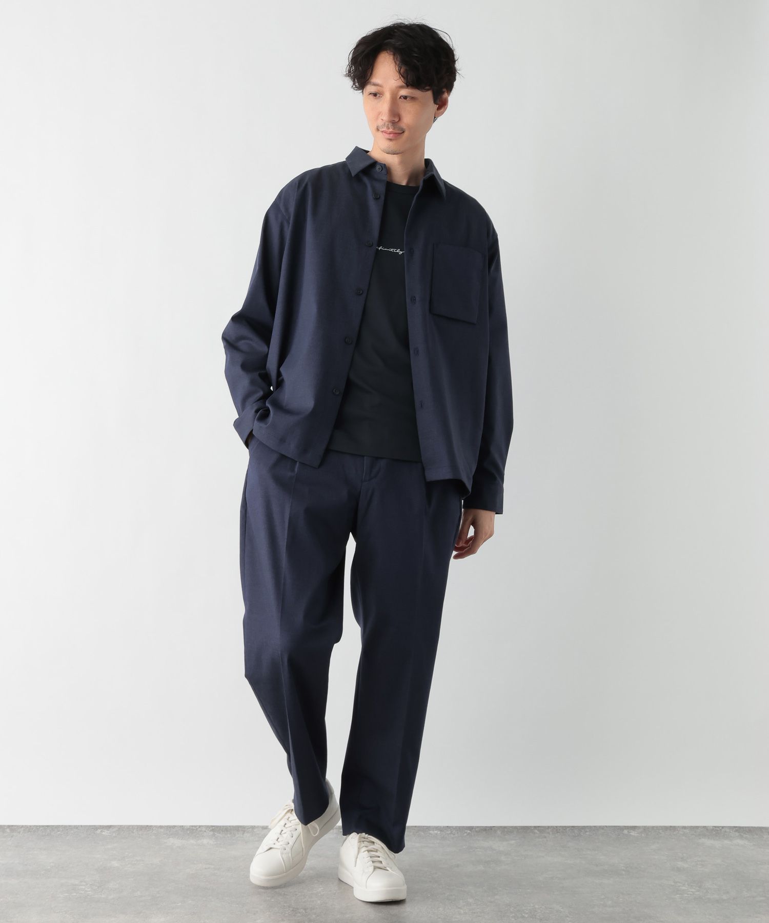 同じくアーバンシャツなどカジュアルなアイテムと合わせても、だらしなく見えず大人っぽくキレイ目な印象でご着用いただけます。
