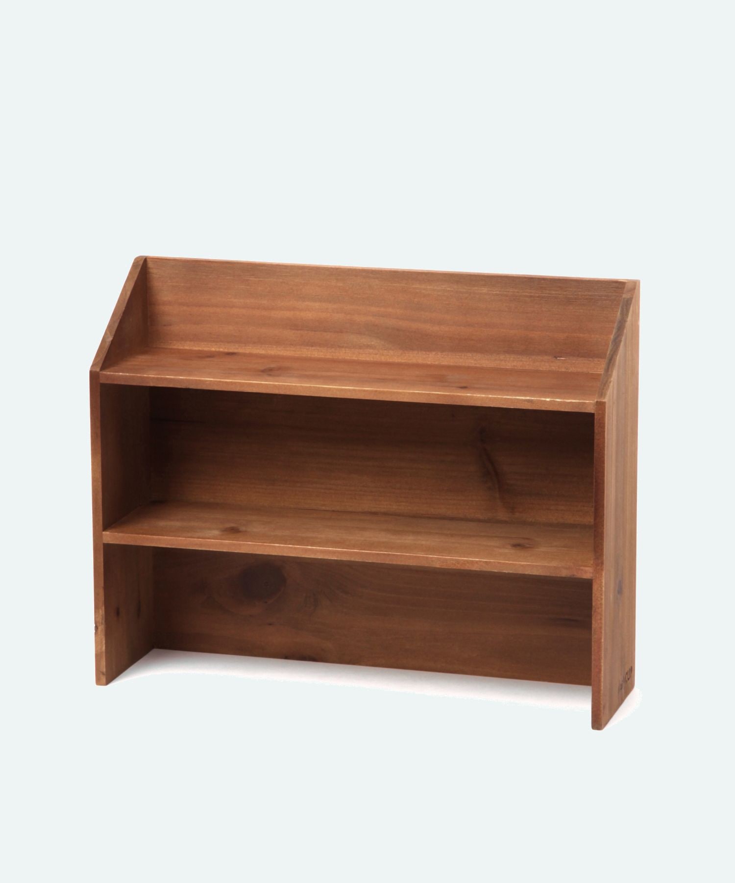 癖のない素朴な棚です。奥行きはそんなにないので置きたいものによってははみ出します。お気に入りのグッズやコスメをちょこっと置いて使いたかったので自分的には気に入っています。我が家のキッチン用品ははみ出しました。