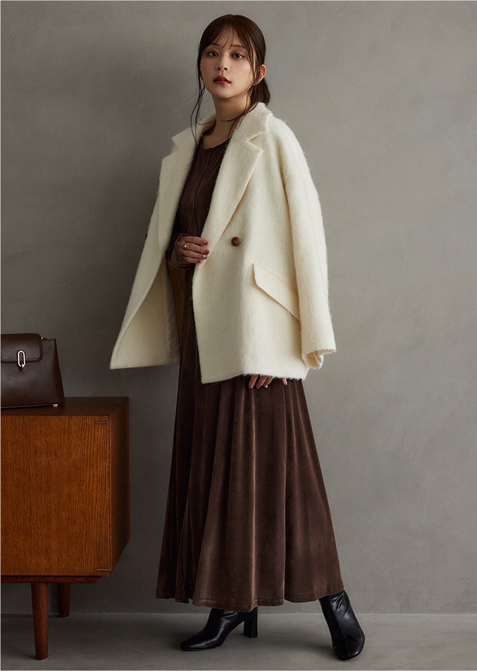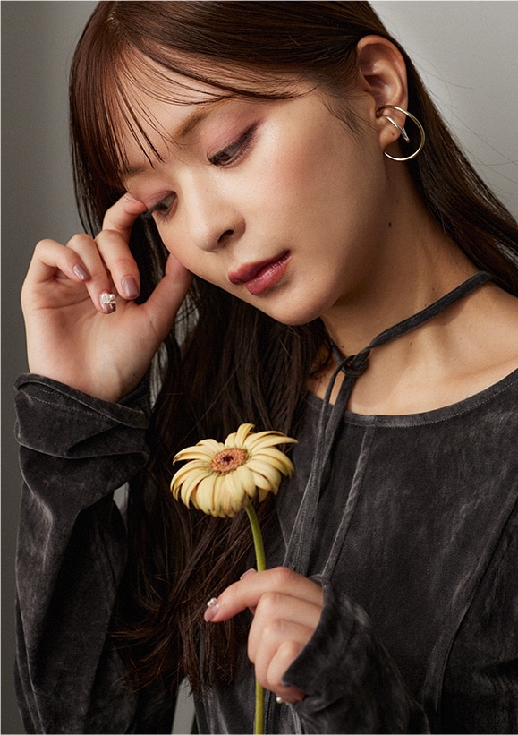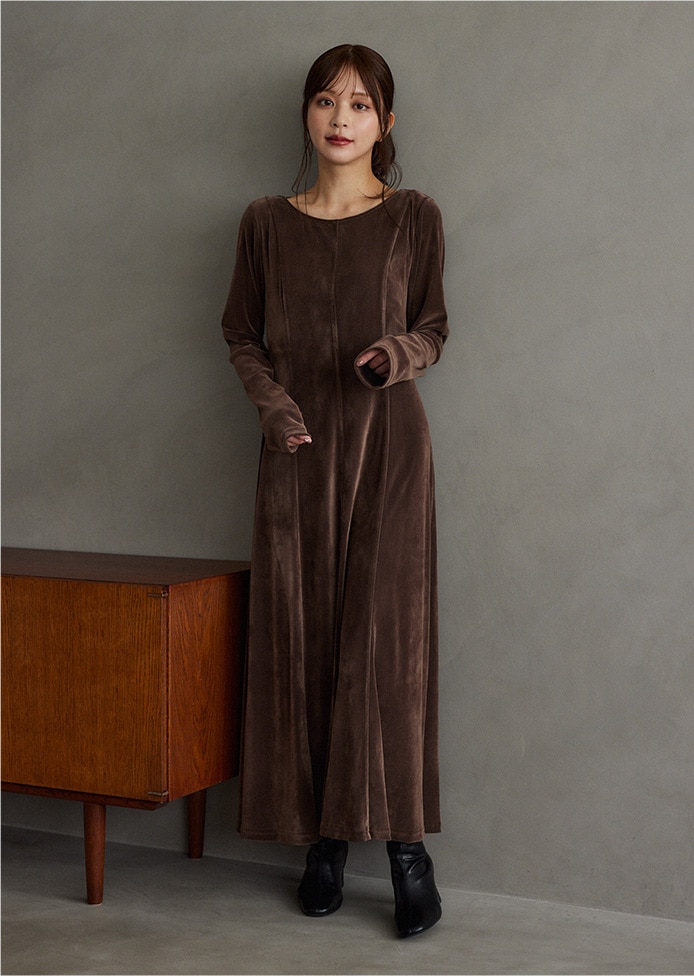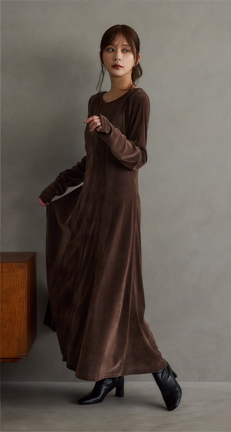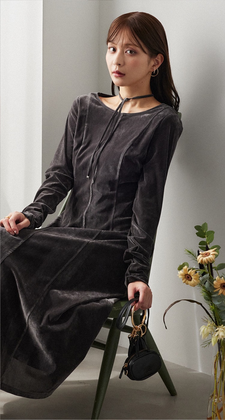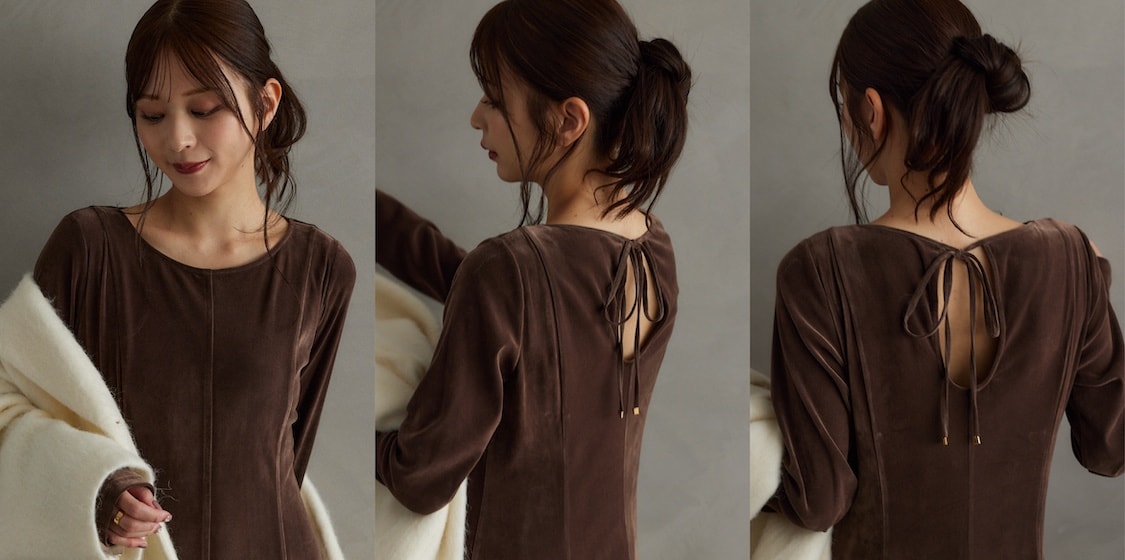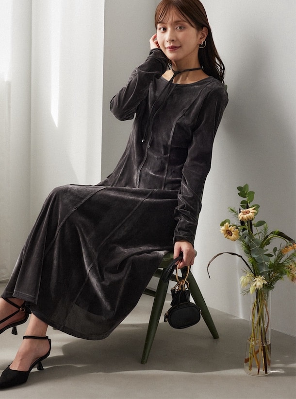 「デコルテと背中を美しく見せる、抜け感のあるデザインがお気に入り。ウエストをキュッと絞って、スタイルアップも意識しました。上品に高見えさせてくれるベロア素材が、女性らしさを引き立てる一枚です」