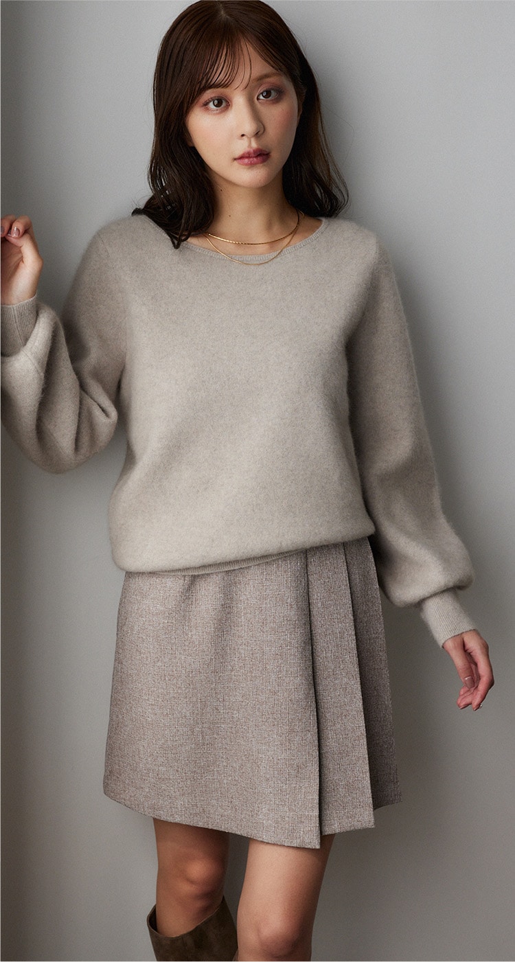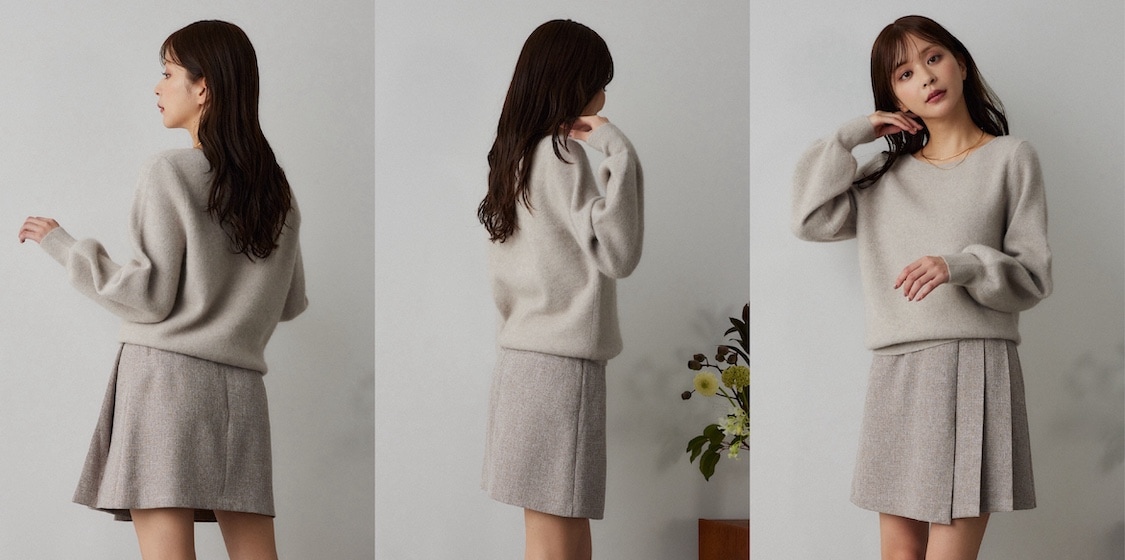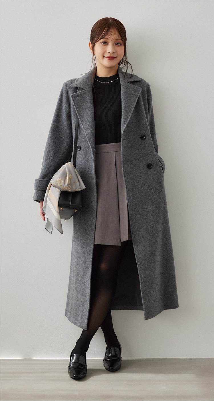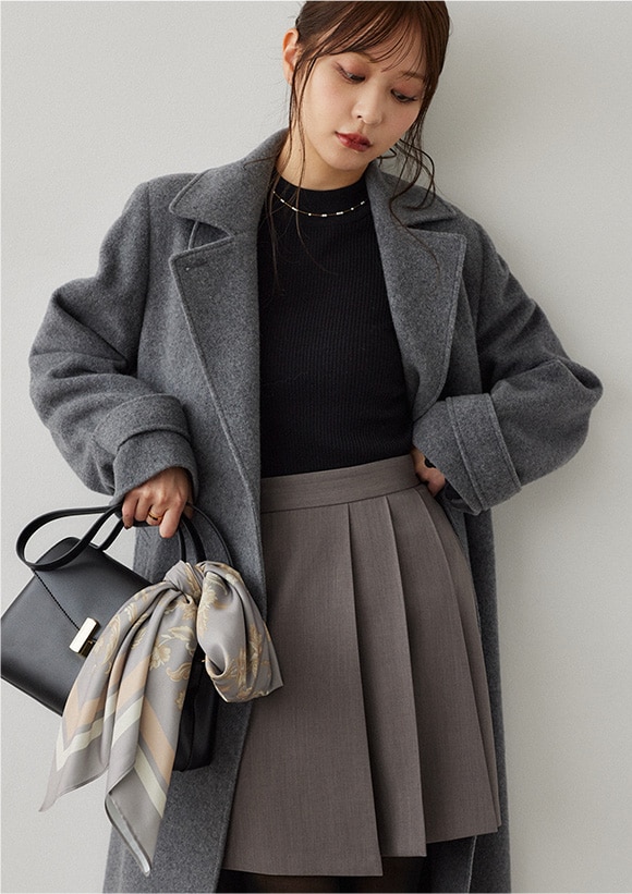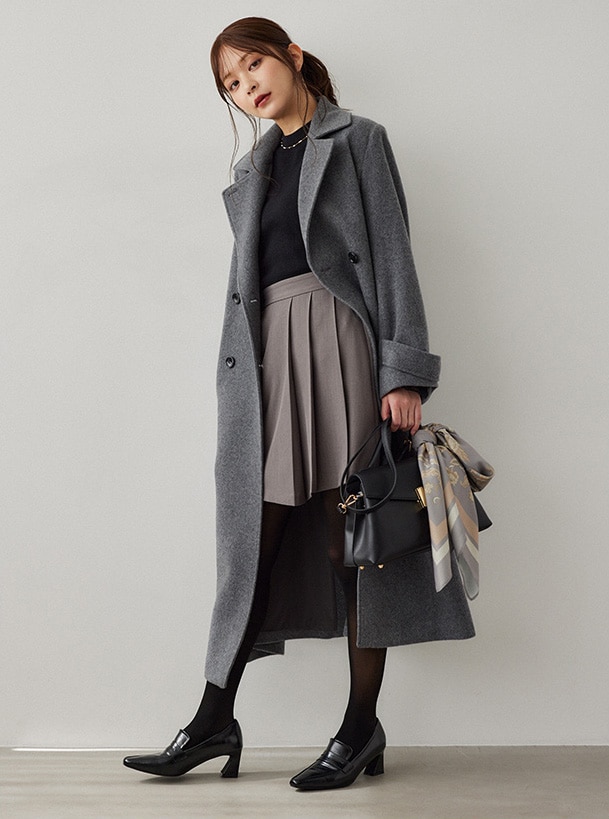 「冬だけでなく、3シーズン着こなせるように万能なグレーをセレクト。クラシックなシルエットに、ハーフプリーツでほんの少し遊びをプラスしました。フェミニンとモードのバランスを意識してデザインしています」