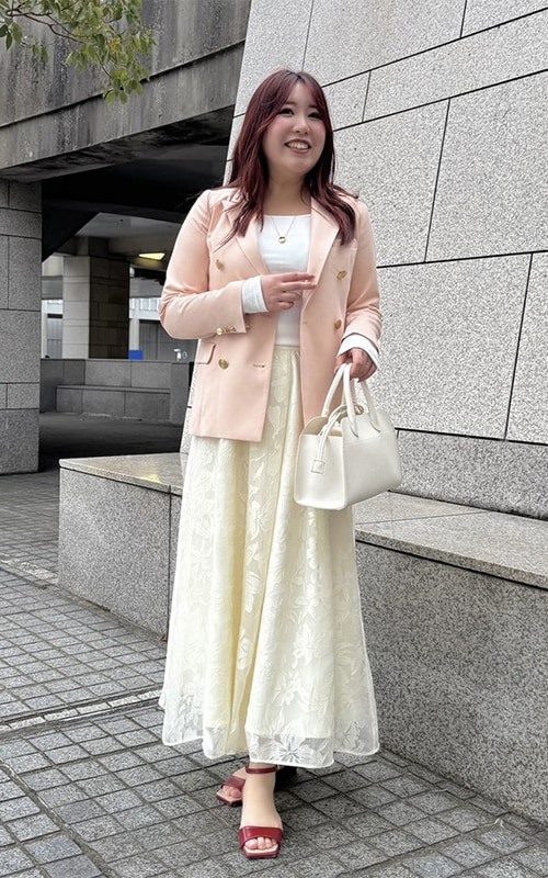 小物使いで女性らしさをプラス。