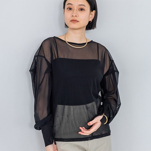 袖にタックデザインの入ったチュール素材のパフ袖ブラウス。袖口は長めのカフスに大き目のスリットを入れて今っぽさと抜け感を演出しています。 -