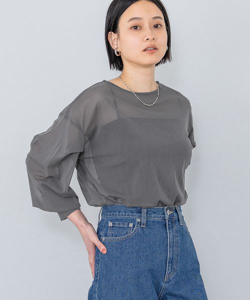 袖にタックデザインの入ったチュール素材のパフ袖ブラウス。袖口は長めのカフスに大き目のスリットを入れて今っぽさと抜け感を演出しています。 -