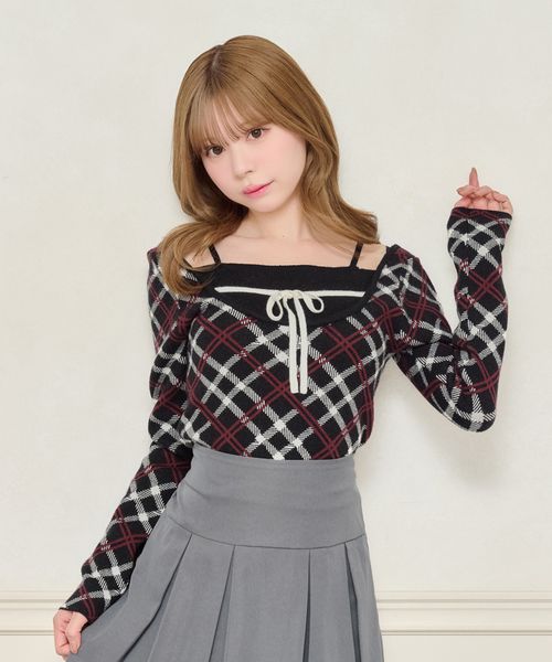 チェックレイヤード風ニットトップス