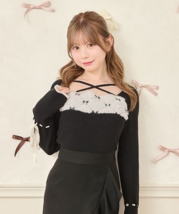 クロス紐リボン刺繍ニットトップス