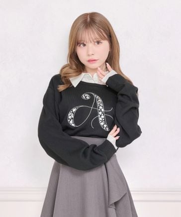 【襟取り外し可能】シャツ付きビジューニット