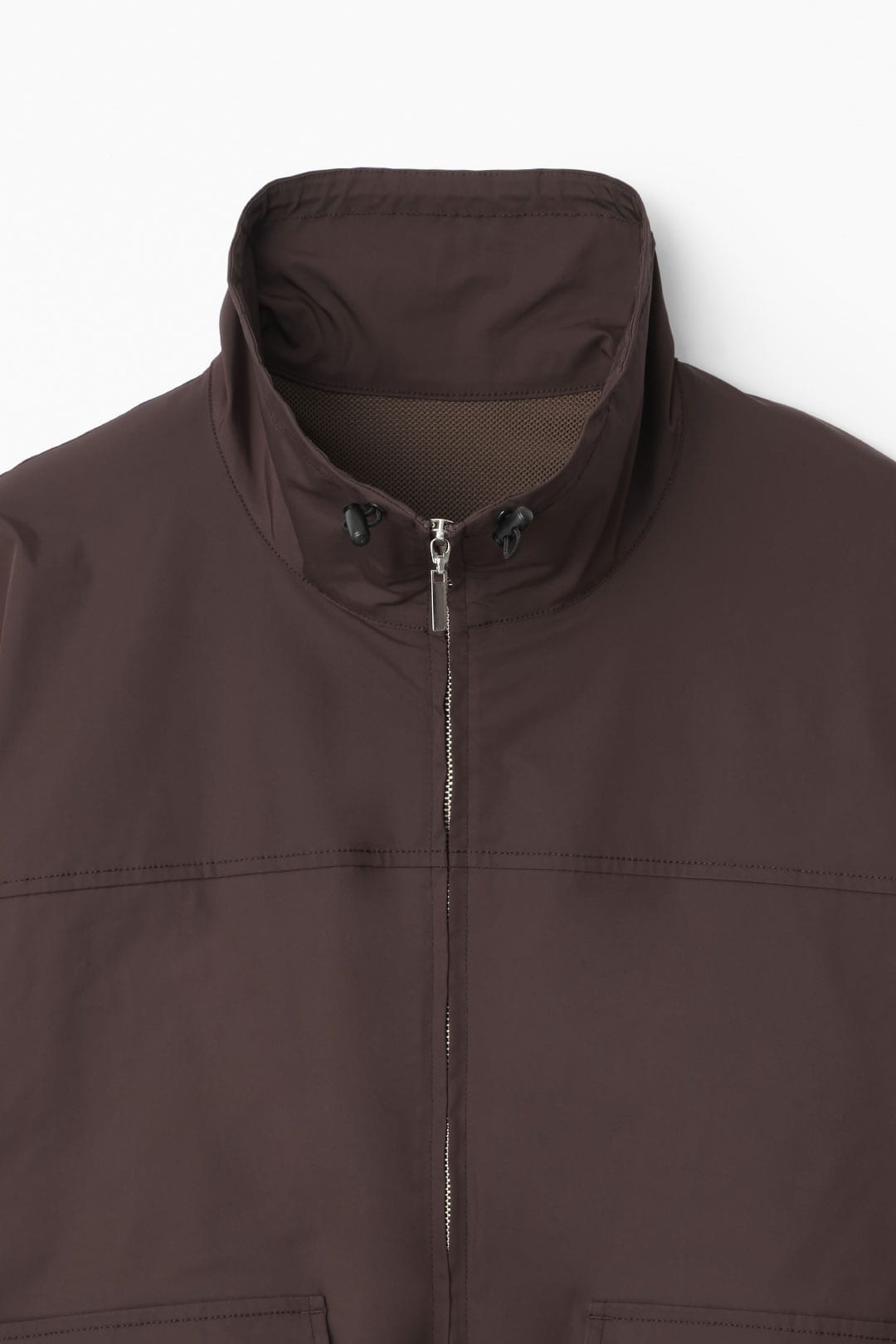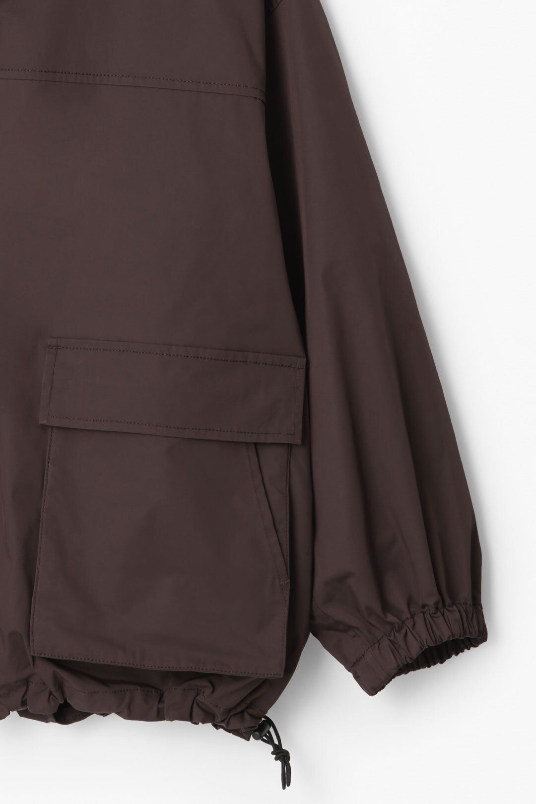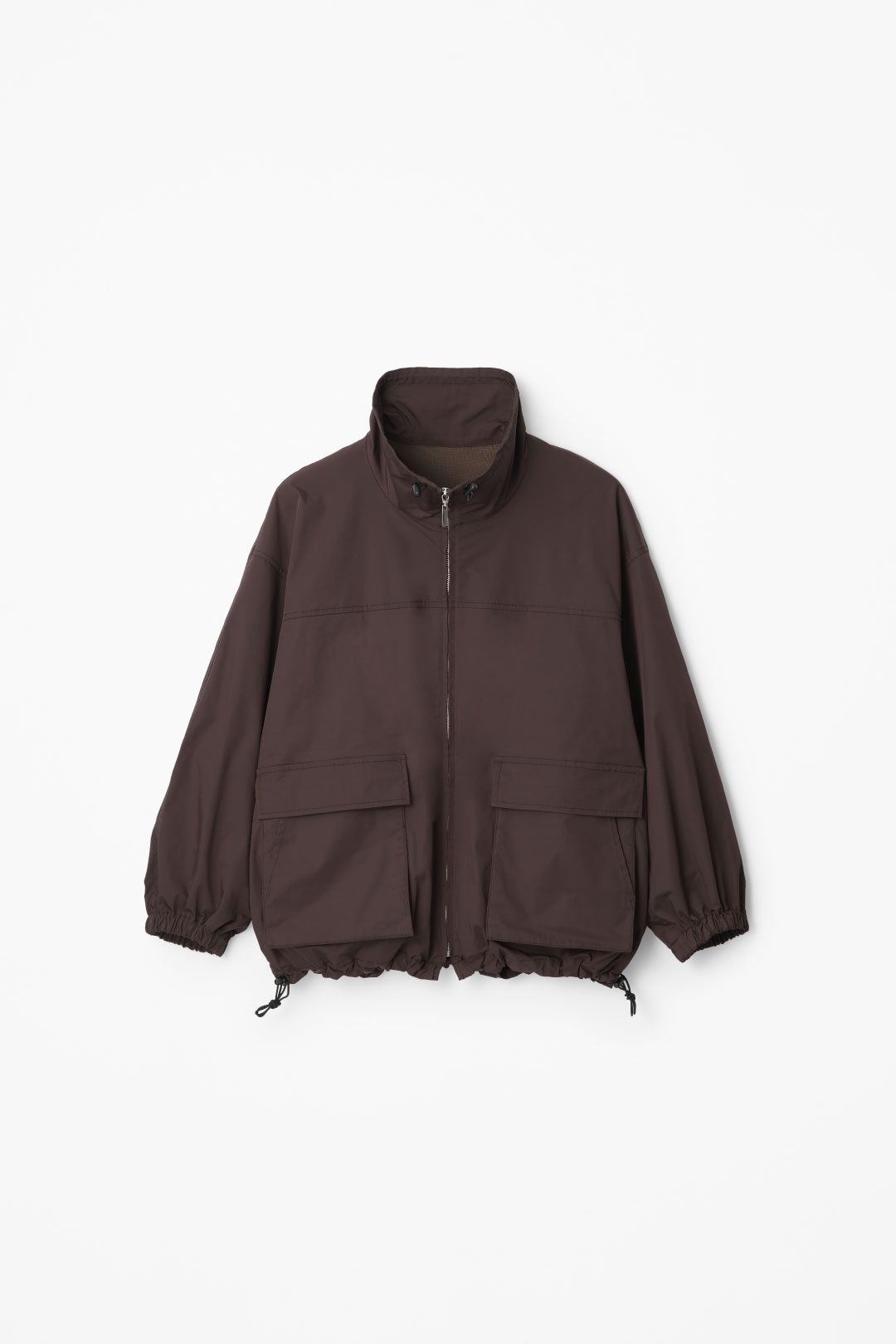 スタンドカラーが印象的なドロストブルゾン。裾と襟口のスピンドルでシルエットの変化を楽しめる高機能な一着。袖はワンサイドラグランで動きやすく、ポケットはフラップ口からも脇スリットからも使用可能。撥水加工で天気が不安定なシーズンにも使いやすく、バックスタイルの重なった身頃のインナーは、吸汗速乾・帯電防止機能のあるメッシュを使用しており熱や汗がこもりにくい仕様になっています。