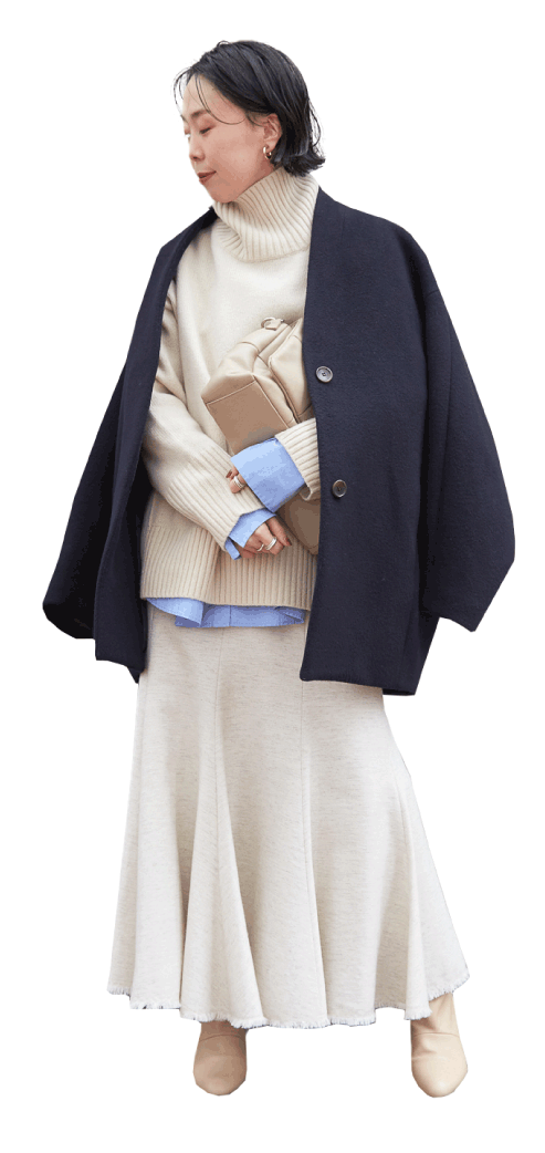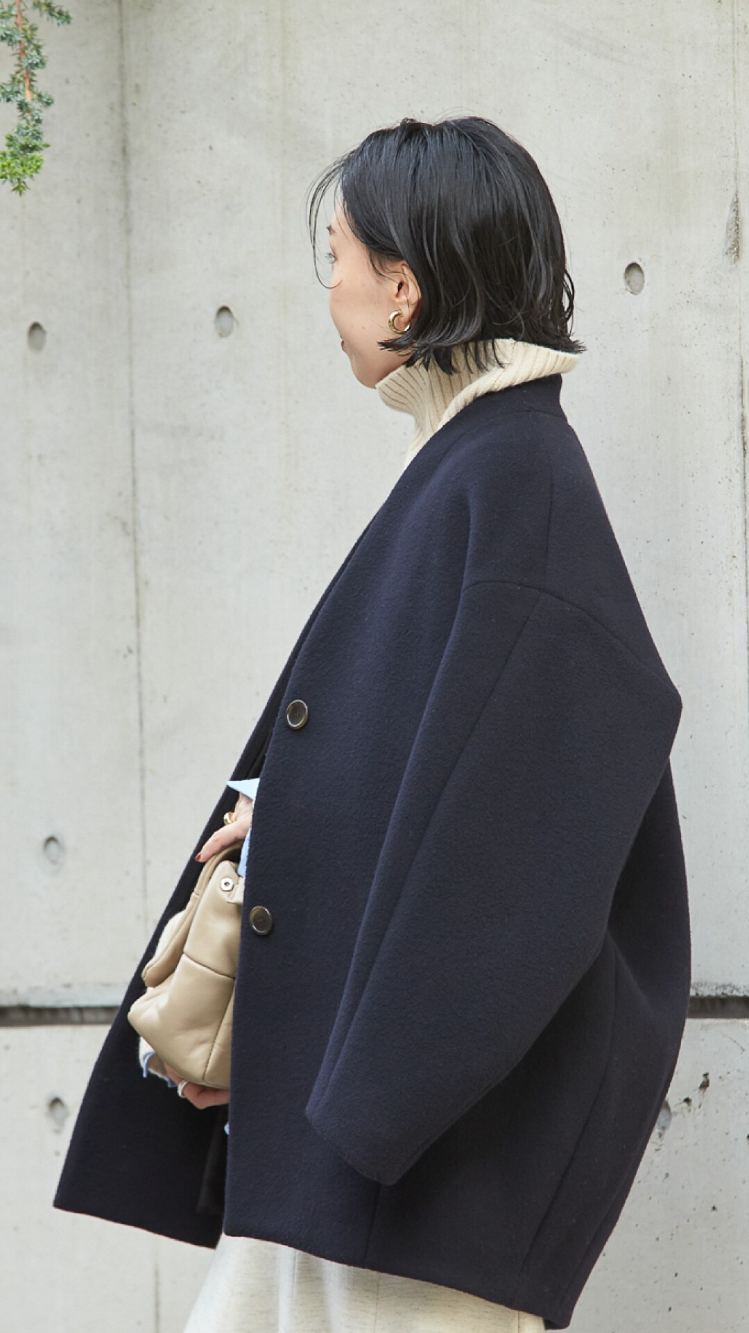コクーンシルエットのノーカラーコート。後ろの切り替えやダーツで程良い丸みを作り出し女性らしい柔らかな印象に仕上げました。さっと羽織るだけでフォルムが出る1枚。重ね着をしても着ぶくれしないサイズ感もポイントです。ラムズウールを使用した、軽さもありながら暖かい、膨らみのあるソフトな風合い。獣毛素材の本質を最大限に活かした素材です。