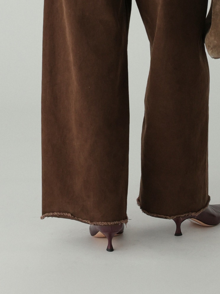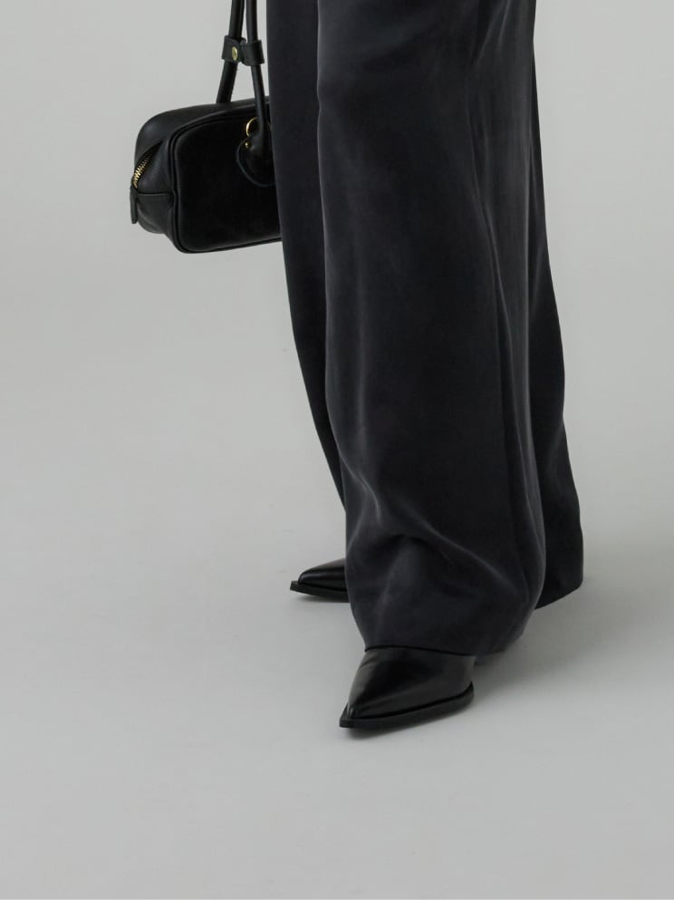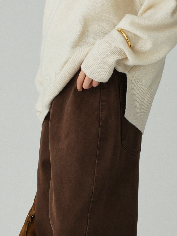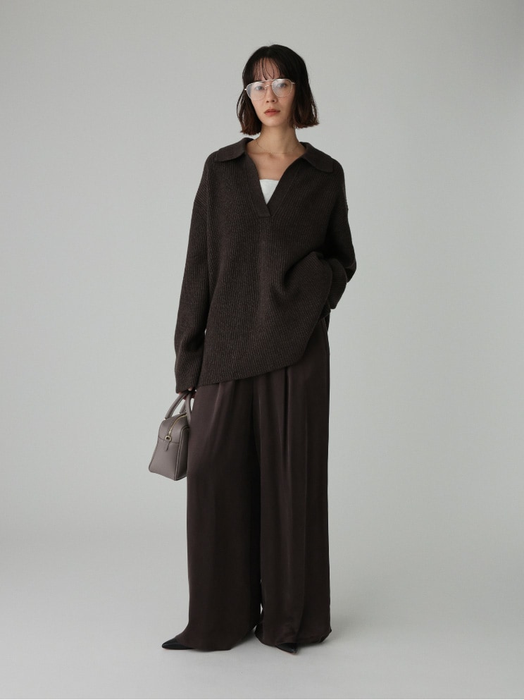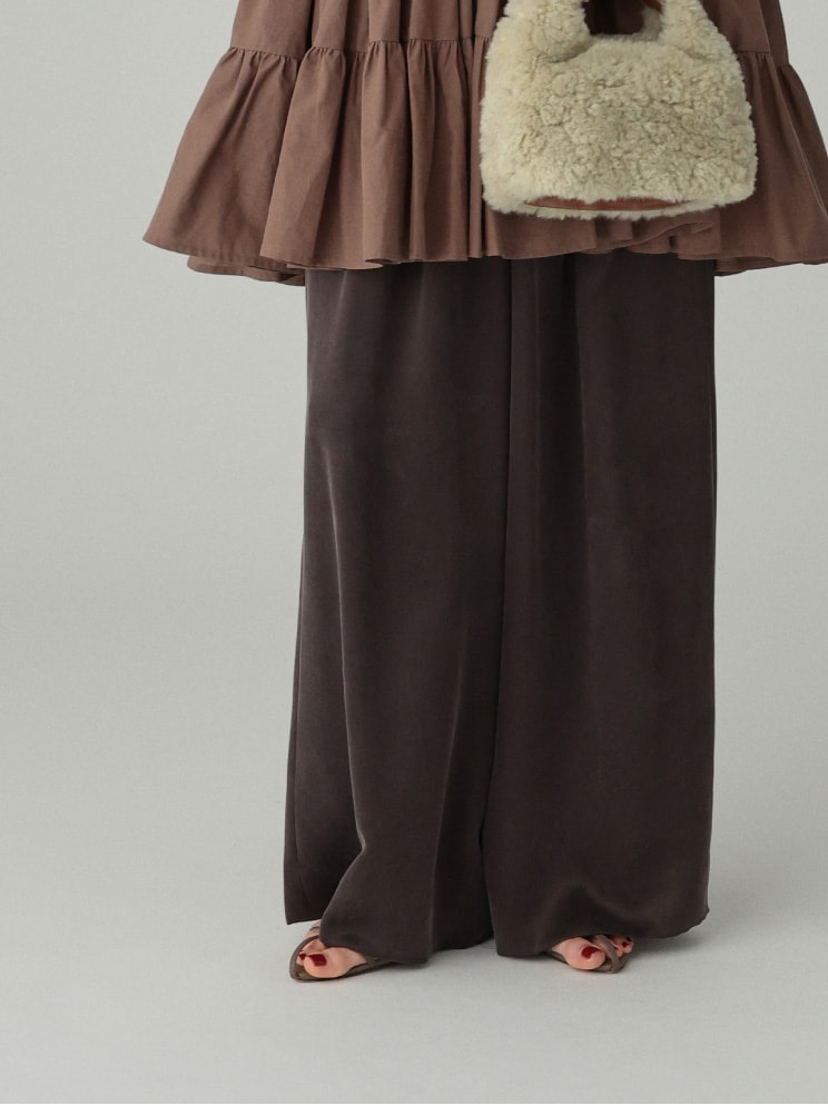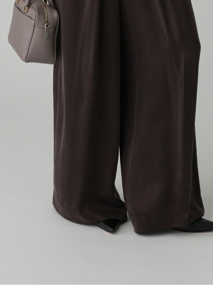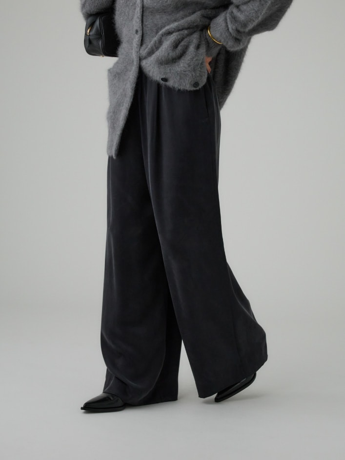 なめらかでドレープ感のあるイージーワイドパンツ。イージーパンツながら、ワンタック入りでヒップ周りが横に広がりにくいこだわりのシルエット。滑らかな肌触りと、ウエストゴムで履き心地抜群。どんなスタイリングも洒落させる優秀な一本です。
