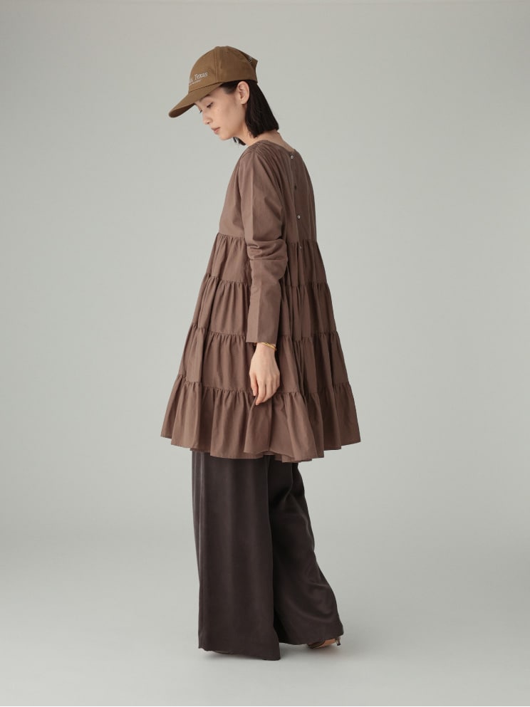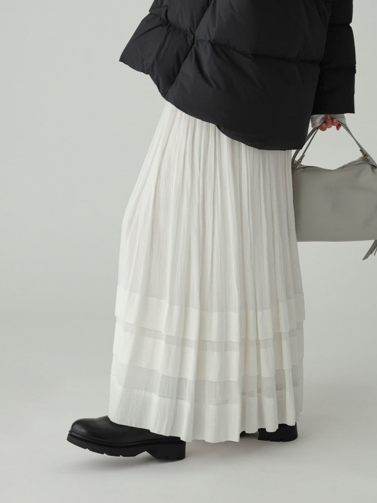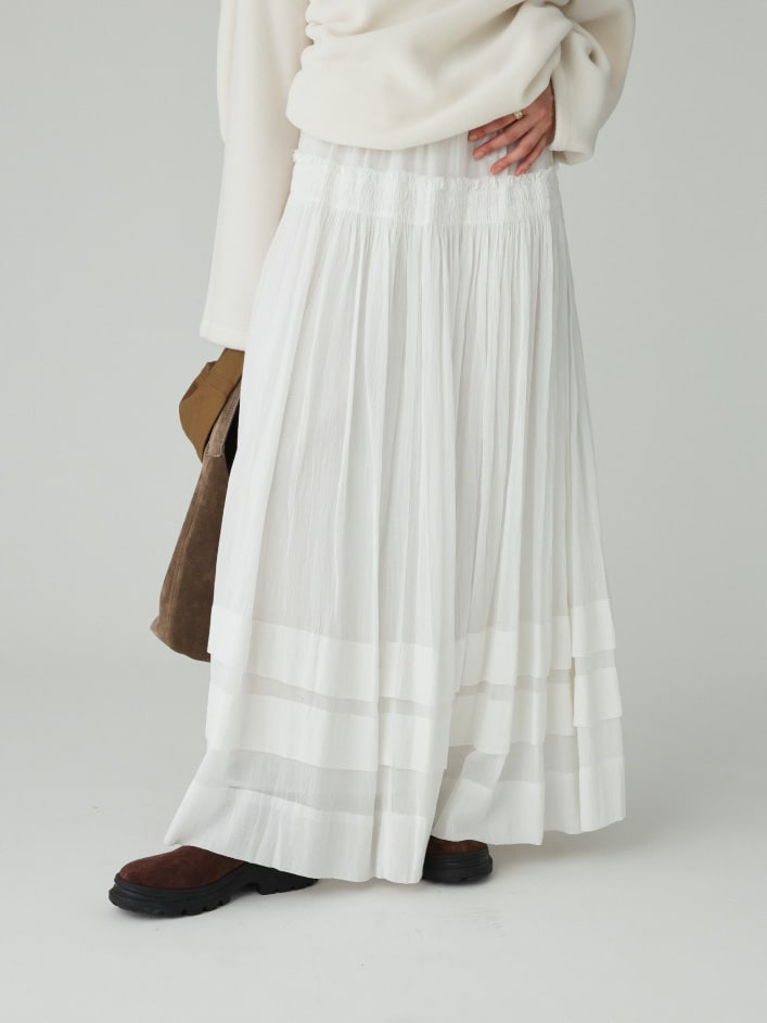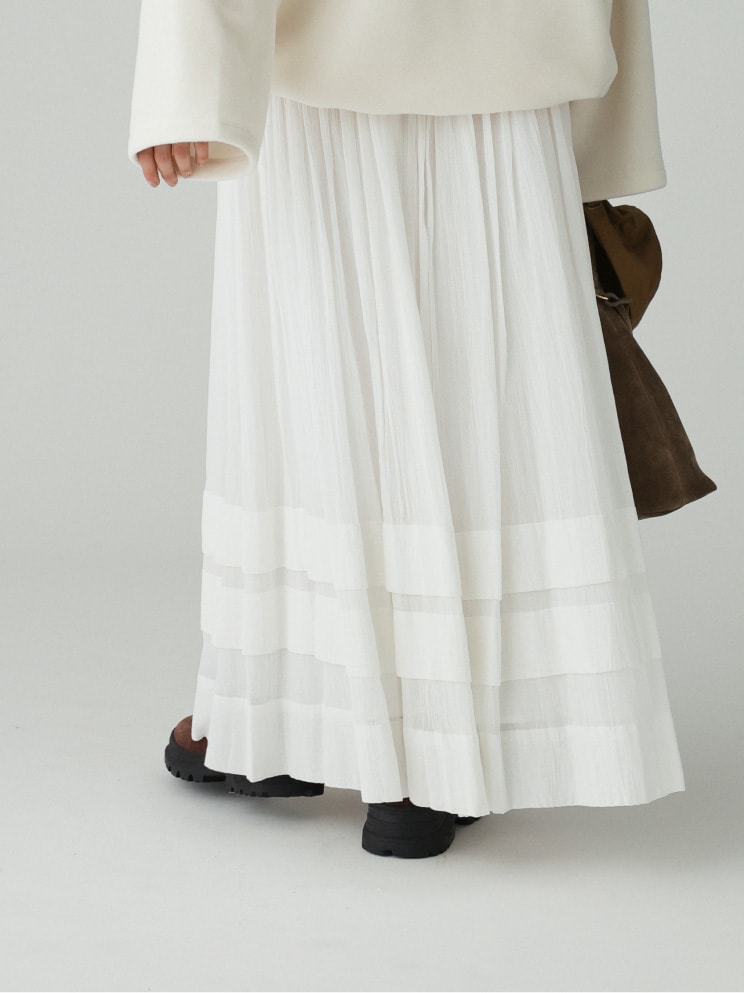 裾のタックデザインがポイントのフレアスカート。ドラマチックな分量感がありながら、繊細な素材で生まれる軽やかなシルエット感が特徴。秋冬コーデを上品に格上げしてくれる、質の良いインド生産のアイテムです。程よい透け感があり、ニットやアウターにも合わせやすい一枚。