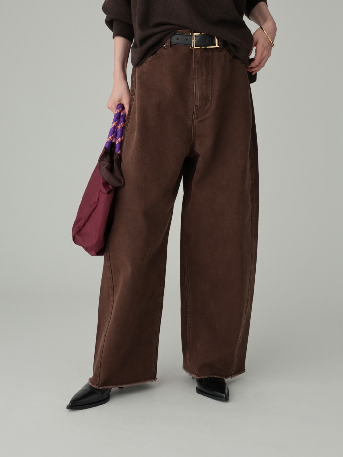 トレンドのバレルシルエットのデニムパンツ。サイドの接ぎのみで仕立てた、ダーツの無いこだわりのパターン。柔らかく、着心地の良さもこだわりのひとつ。裾がカットオフになっているのがポイント。どんなトップスを合わせてもトレンド感のあるスタイリングになる、頼れる一本。