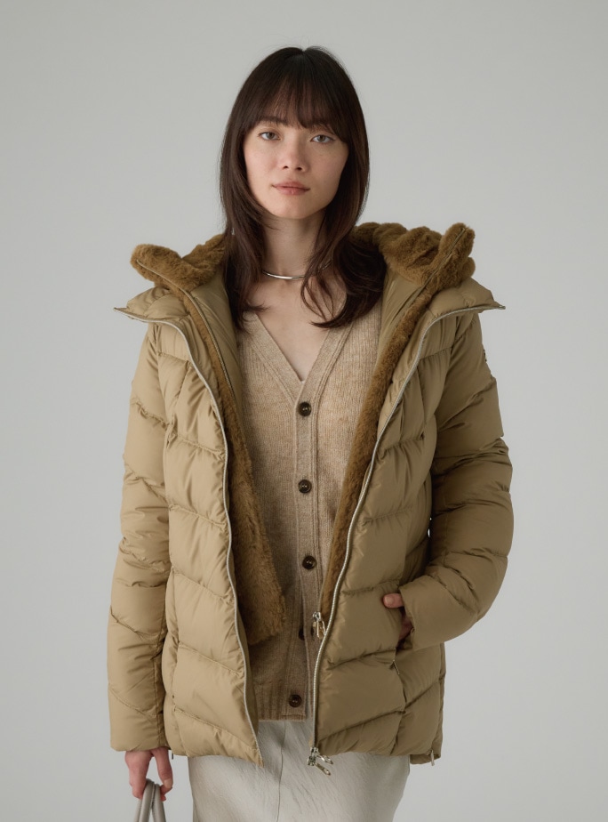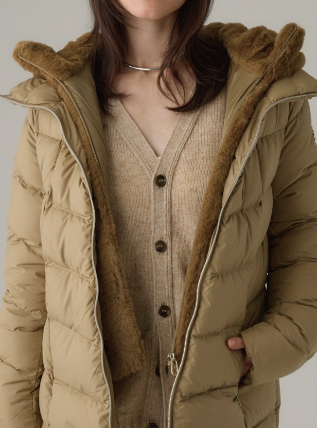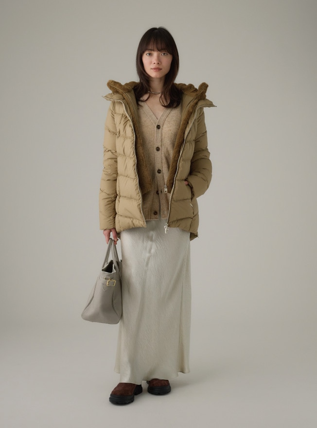 大人フェミニンを叶える「BEIGE」重たくなりがちな冬スタイリングを、ぐっと華やかにしてくれるカラーです。バイヤーがセレクトしたのは、エコファーとのコンビネーションを楽しめるモデル。トーンを合わせたスタイリングで、女性らしくまとめて。