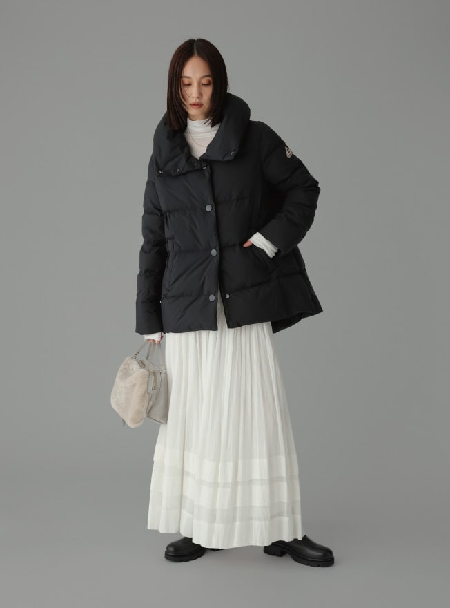 凛と女性らしい「BLACK」ダウンの品質の良さと、美しいシルエットが際立つのはベーシックカラーだからこそ。カラーニットに羽織っても、ベーシックカラーでまとめても決まります。王道ながらも魅力たっぷりのカラー!
