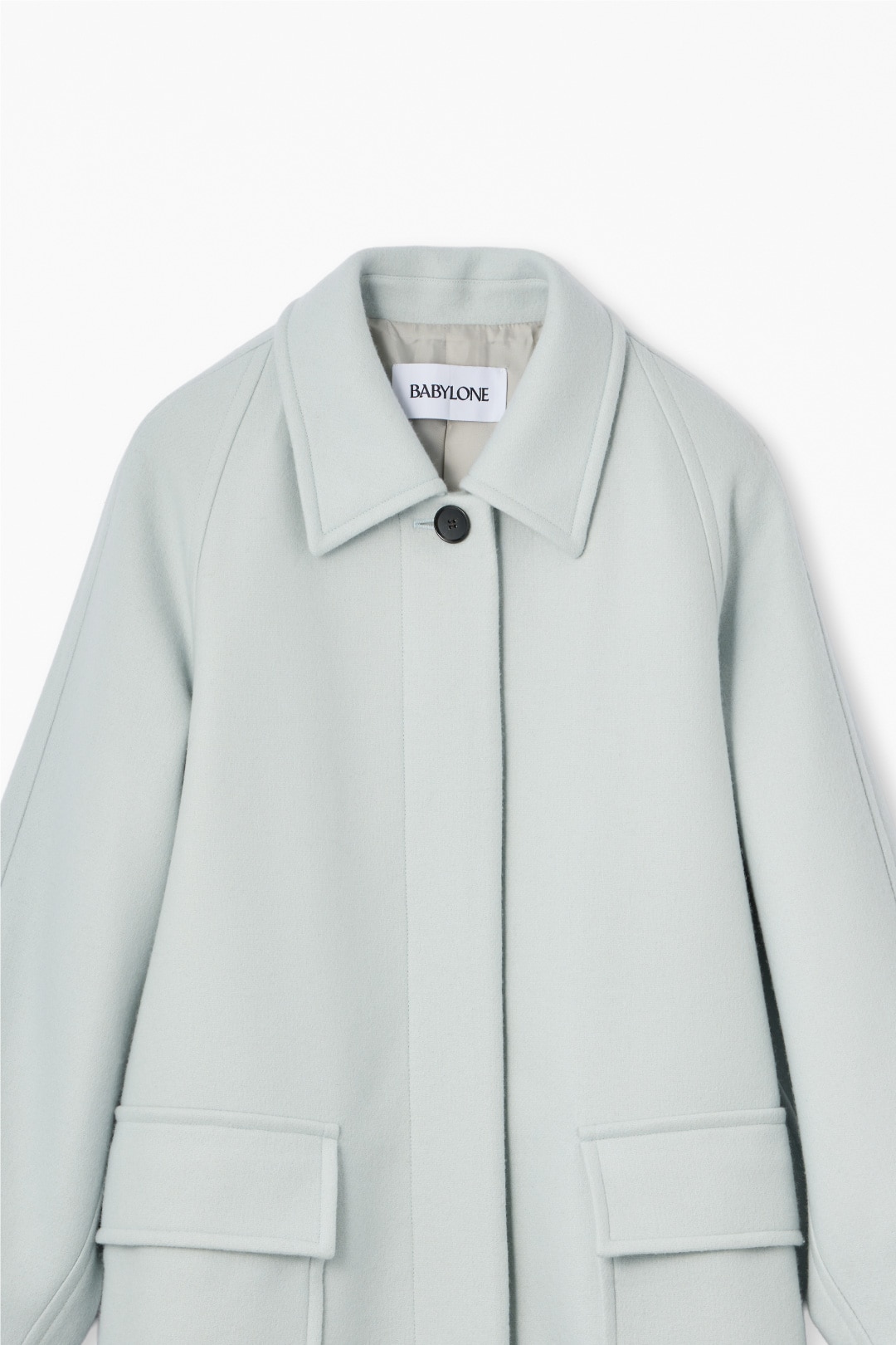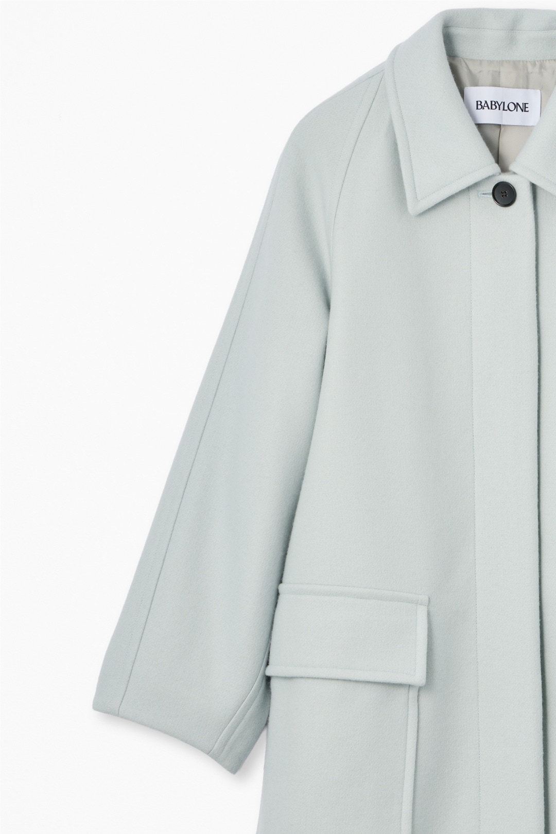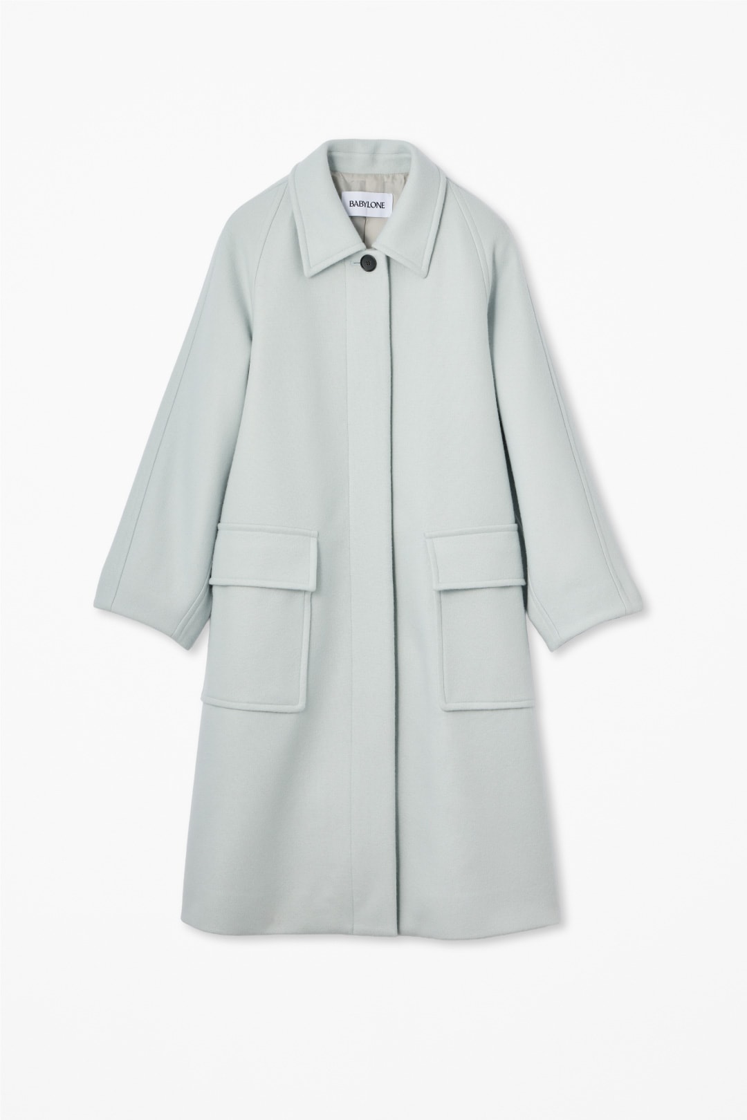 上質なウールを使用した、ステンカラーのメルトンロングコート。 大きめの襟は小顔効果抜群、緩やかなAラインシルエットで足さばきもストレスフリー。アームホールが大きく作られており、中のインナーが嵩張らずに着用可能。ブルーグレーは別注カラーで、こだわりのニュアンスカラー。