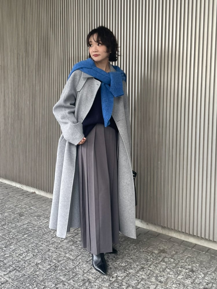 重くなりがちな冬アウターにブルーのニットを肩掛けした抜け感のあるスタイリングです! プリーツスカートを合わせて女性らしさをプラスしました。シンプルだけど印象に残る、大人の上品カジュアルスタイルです。