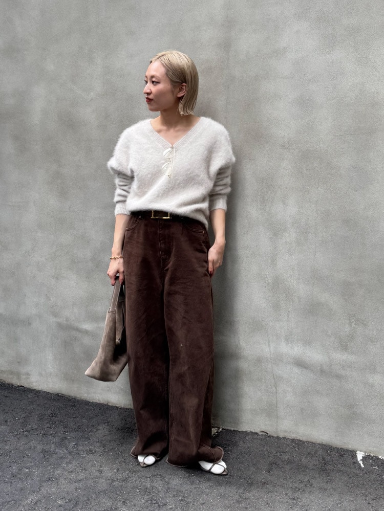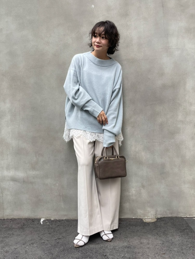 ゆるめのシルエットとレイヤードで抜け感を出しつつ、全体を淡いワントーンでまとめた大人カジュアルコーデにしました♪シンプルだけど雰囲気のあるニットとパンツは休日にもお仕事にもちょうどいい着回し力のあるアイテムです♡