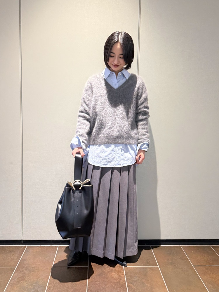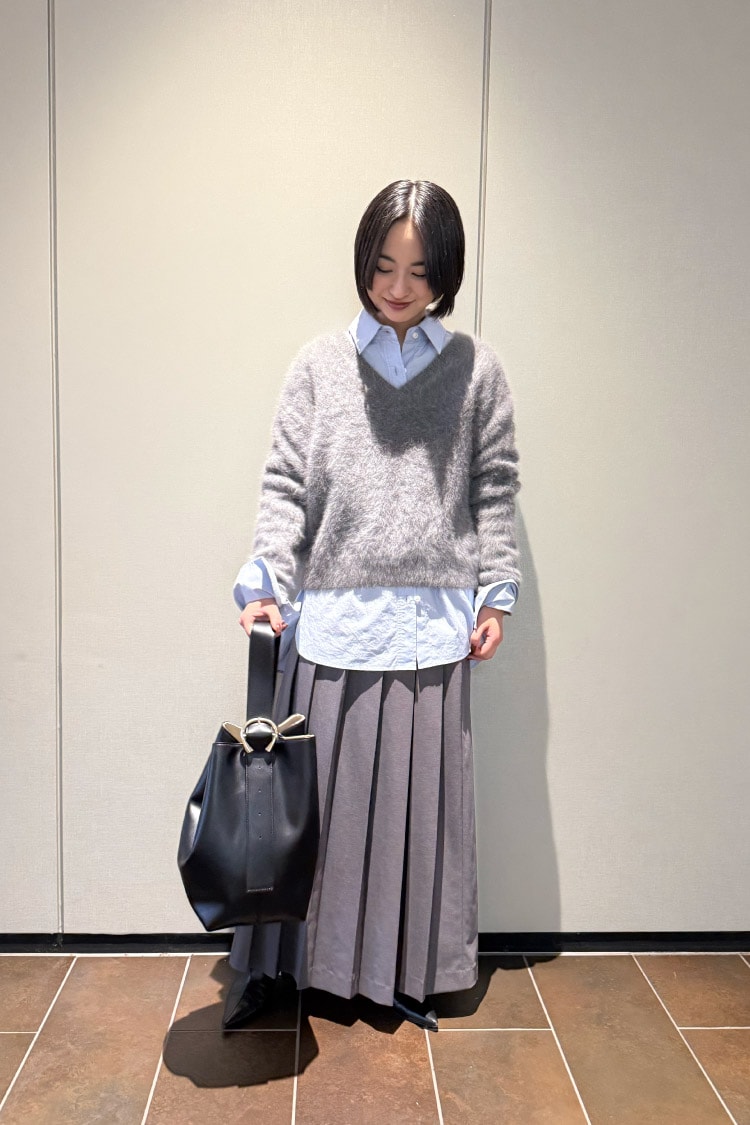 毎年人気のFOXカシミアニットを使ったコーディネートです。首周りが寂しかったのでシャツをレイヤードしてみました。今年はスカートスタイルを楽しみたいのでプリーツスカートで大人カジュアルな雰囲気にしました。