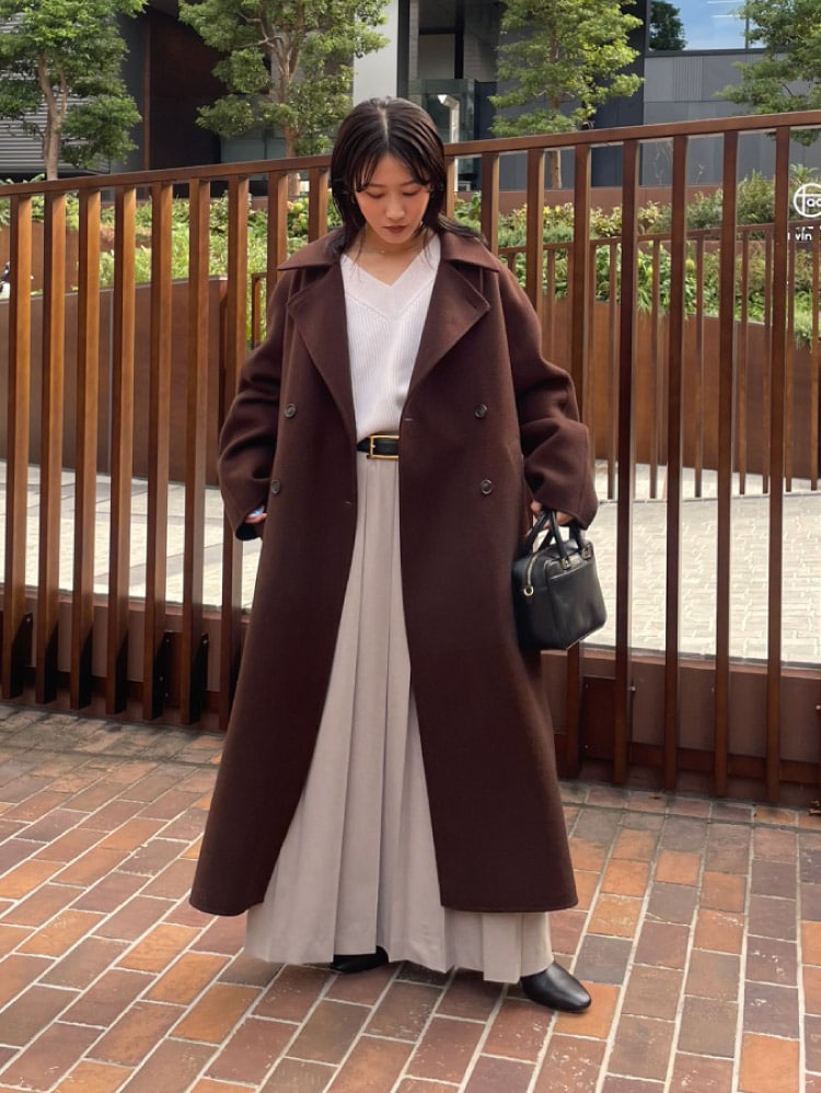 羽織るだけでグッと今年らしくなるこっくりブラウンを主役に、中ものはホワイトのワントーンでまとめました♪