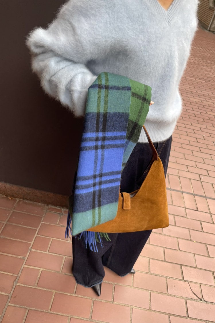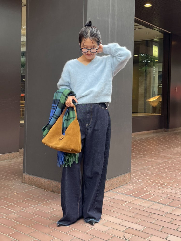甘くなりがちなフワフワニットはボトムや小物でカジュアルダウン!寒色のストールで統一感をだしつつ、今季トレンドのブラウンを差し色に♡