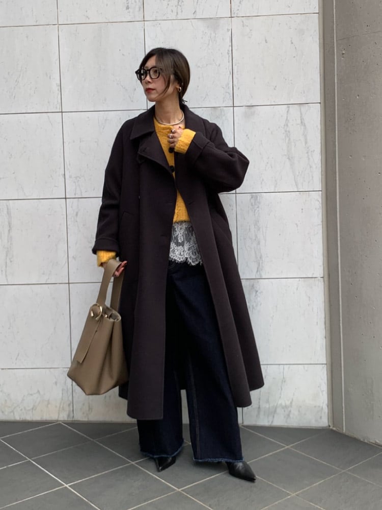 リバー仕立てのコートは軽くて柔らかく、しなやかな風合いでツヤ感のある毛並みで上品見え!敢えてカラーニット×デニムで大人カジュアルに合わせました♪