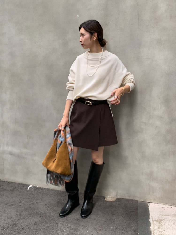 着回ししやすいベーシックニットをトレンドカラーのブラウンで合わせ、小物で大人っぽく仕上げました!大人でも挑戦しやすいミニ丈キュロットパンツで脚長効果も◎