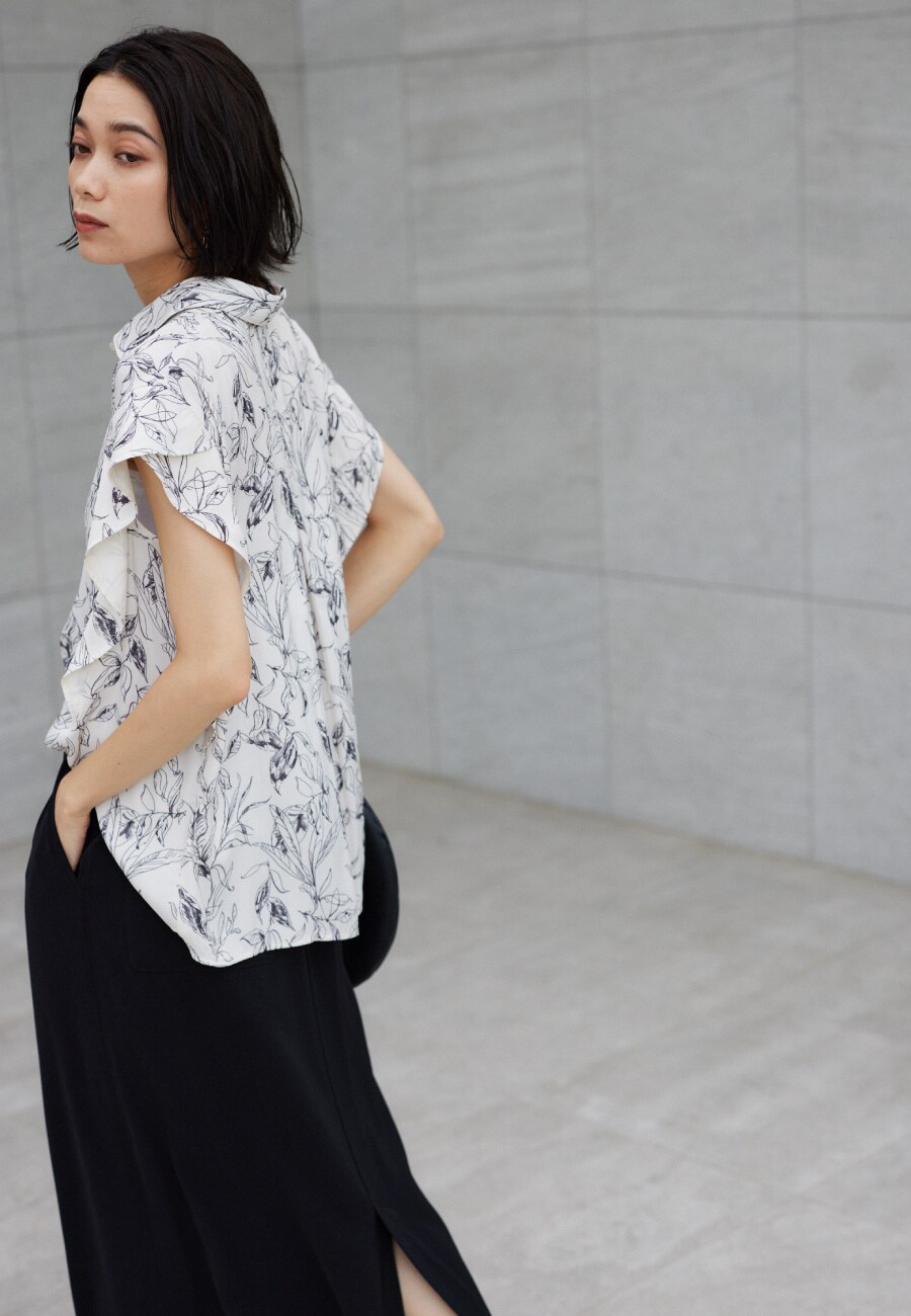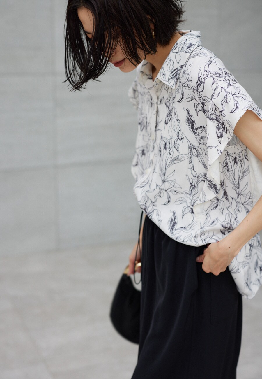 華奢なタッチが女性らしさを引き立てる、BARNYARDSTORMオリジナル柄のブラウス。華やかな袖のフリルはデザイン性だけでなく肩の露出を抑えたデザイン。同じ柄のパンツとスカートとセットアップでも。