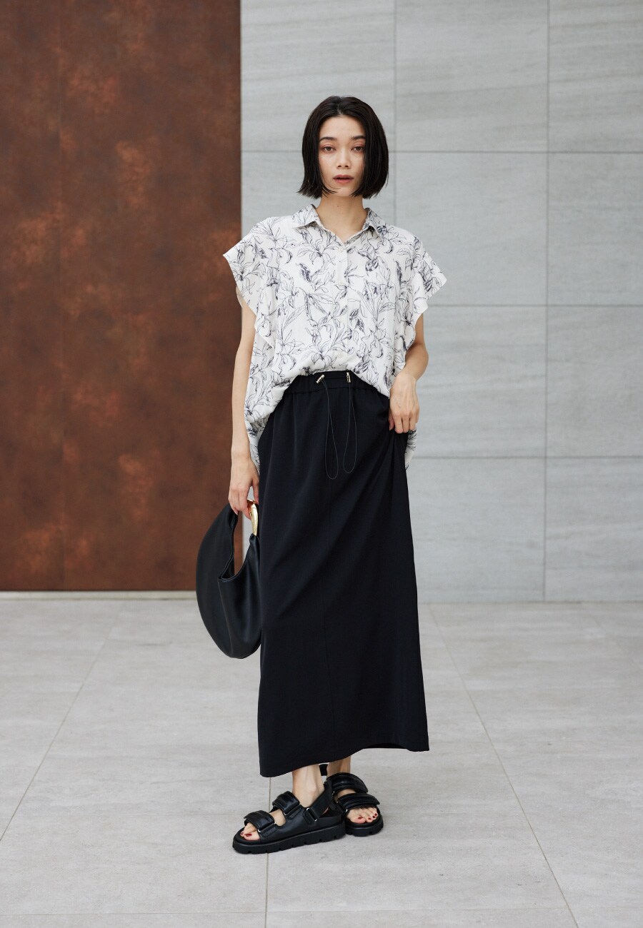 袖にギャザーとタックを施したボリューム感のあるブラウス。ポリエステル100%なのでシワになりにくく、吸水速乾の機能素材も夏に嬉しいポイント。後ろにはパールボタンを付け、バッグスタイルも抜かりないデザインに。