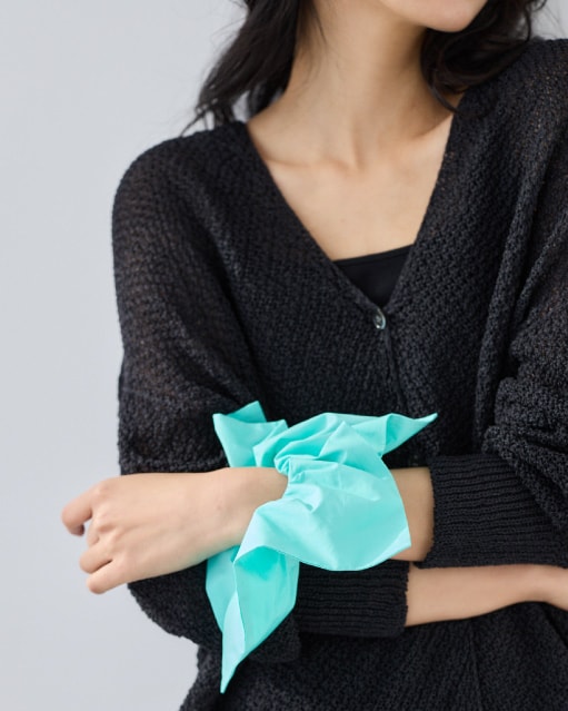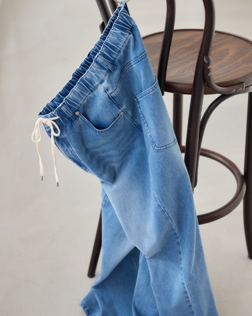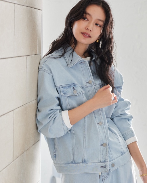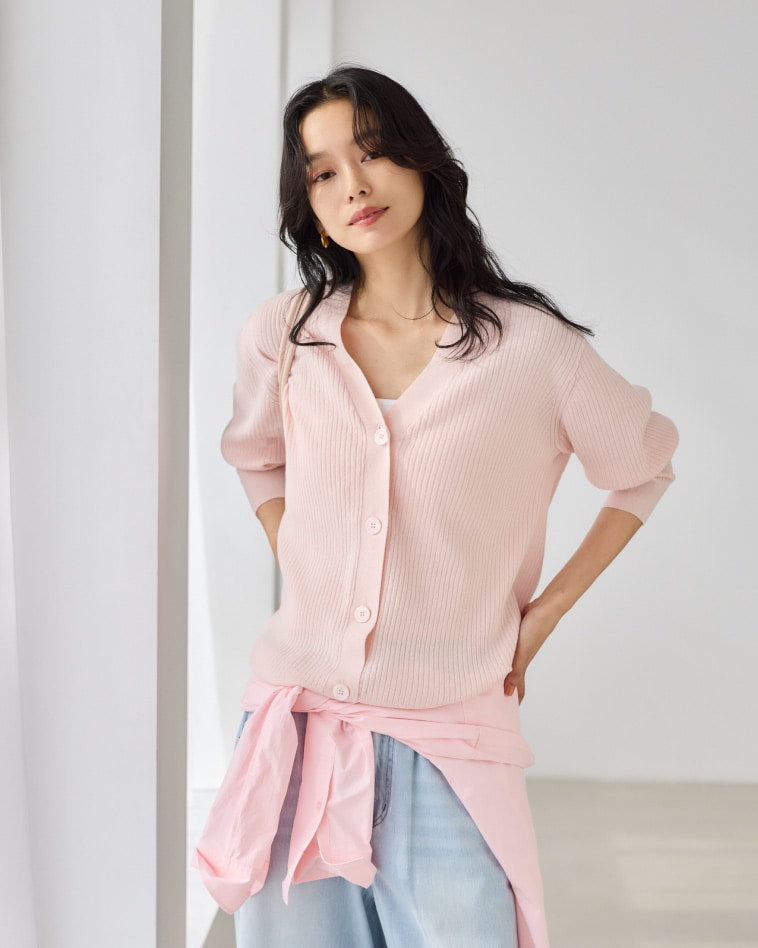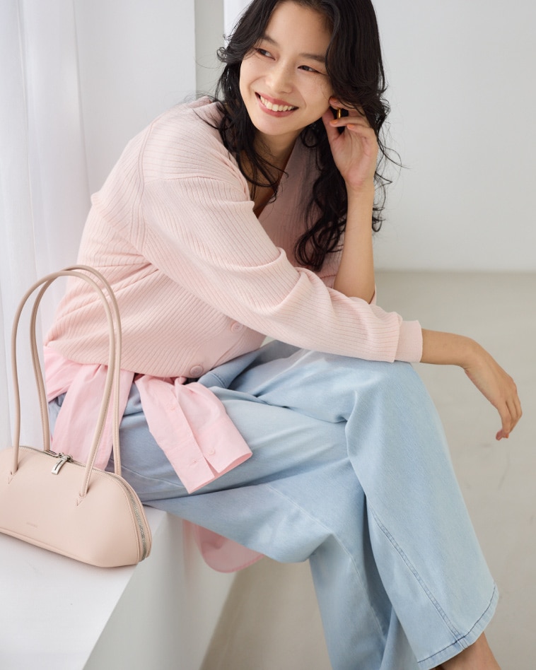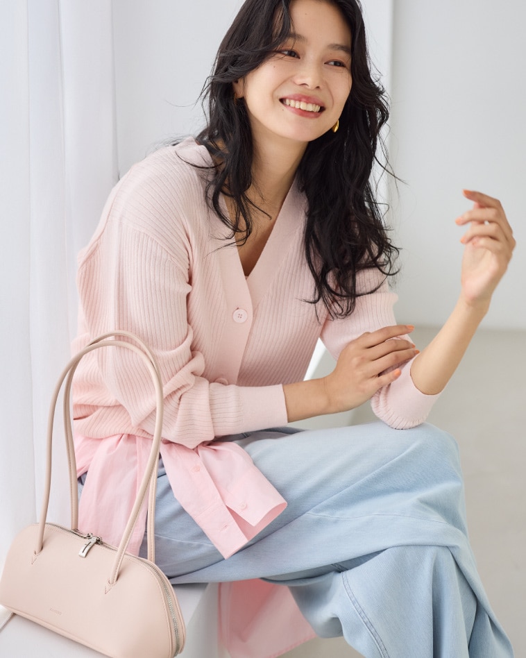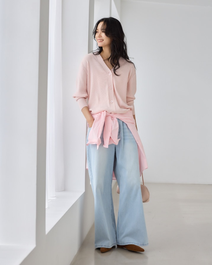 肌馴染みの良い大人ピンクのカーディガンにペールブルーのカットデニムを合わせて、柔らかで女性らしい印象のデニムスタイルに。ポイントは腰に巻いたピンクのシャツ。気温が下がってきたらカーデのインにも着られるシャツは、シンプルコーデのアクセント&ヒップカバーにも。同色のグラデーションが素敵です。