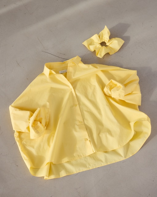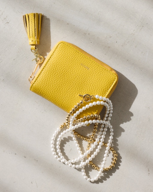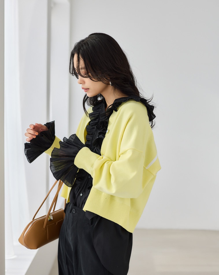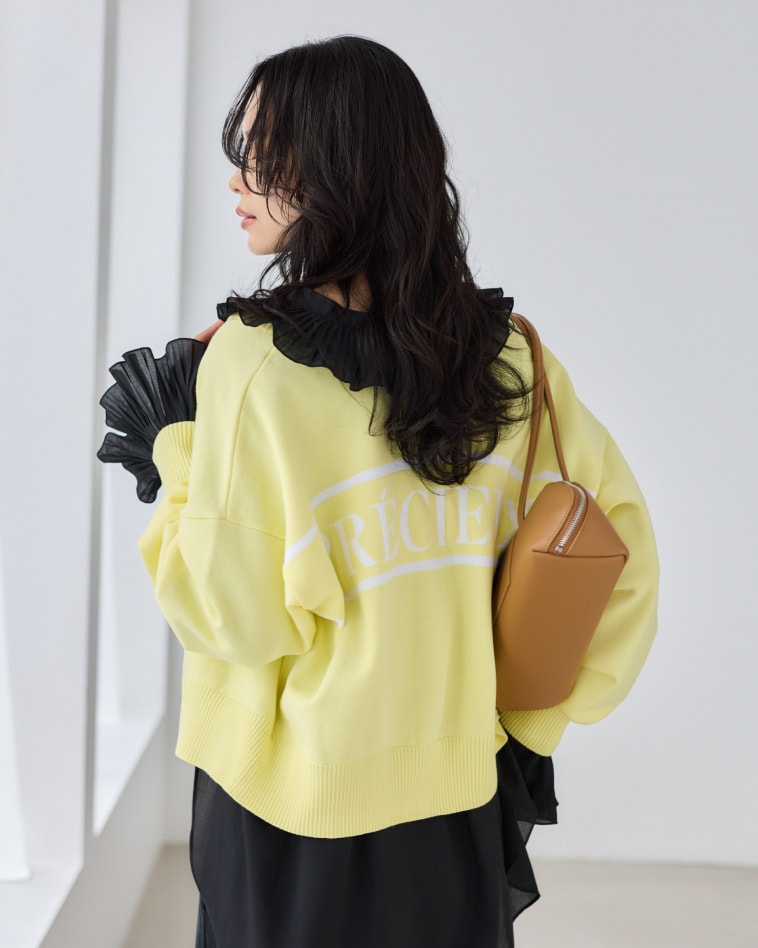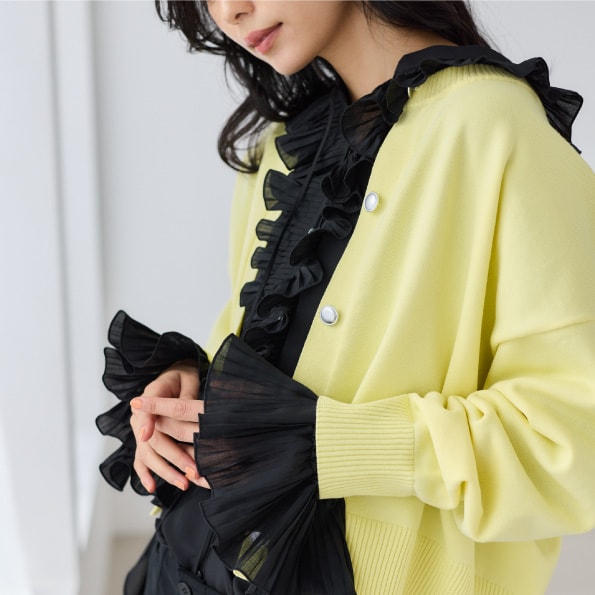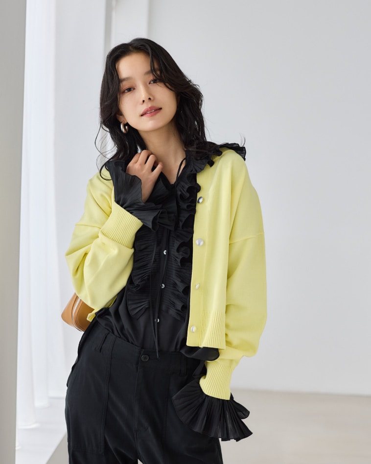 シャープなブラックのワントーンの上に発色の良いイエローのカーデを合わせて。ピリッとシャープな印象の色合わせですが、フリルのブラウスがしなやかで上品なアクセントポイントに。バックスタイルも抜かりないロゴ入りのカーデはいつもより少し短めなので、脚長に見えてスタイルアップ効果も◎