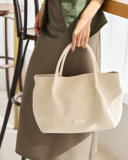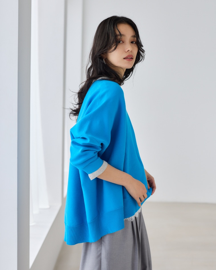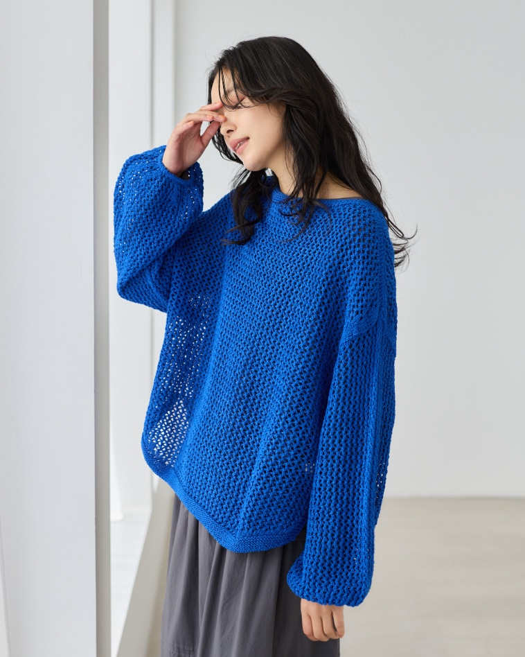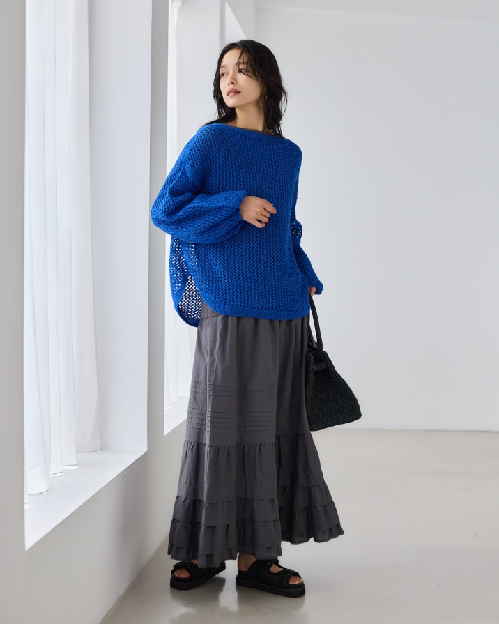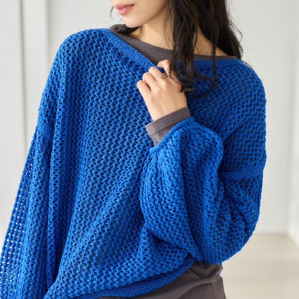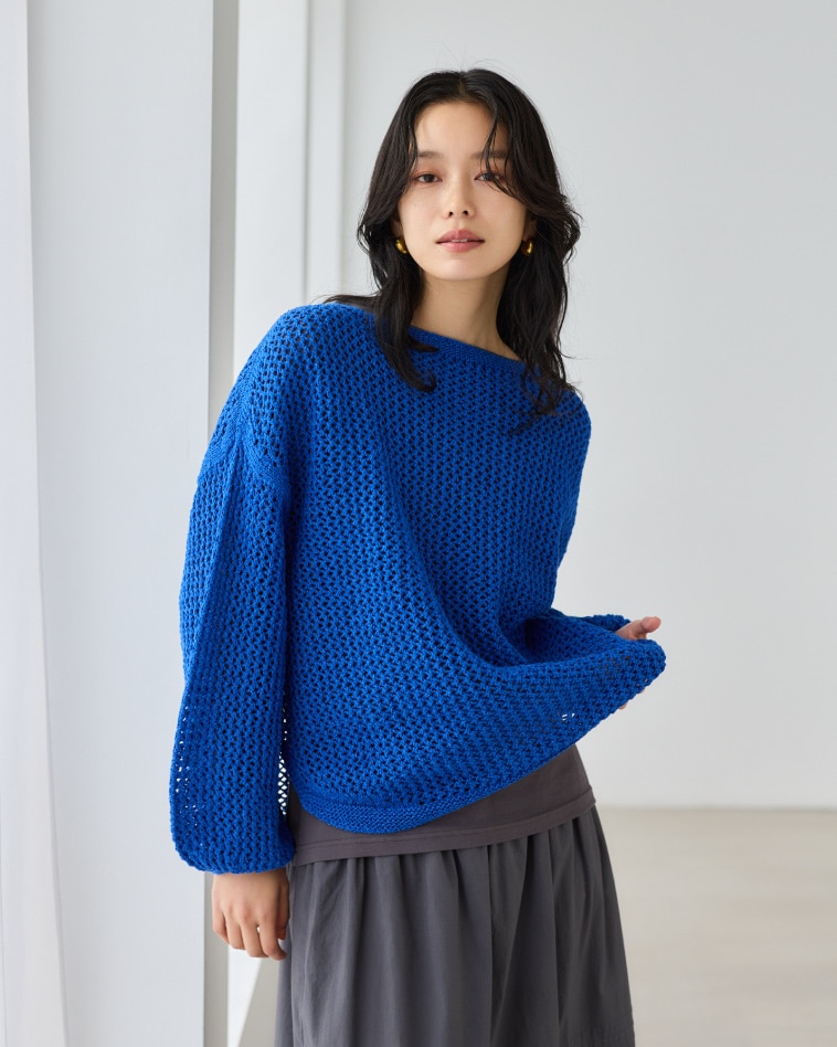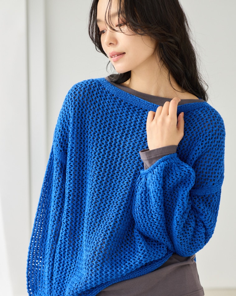 昨シーズンはあっという間に完売したメッシュのニットに新色が登場!ブルーの差し色が新鮮な印象です。一枚だとシアーで涼しく夏まで活躍のメッシュニット。レイヤード用に一緒に作った強撚素材のロンTをイン。誰よりも早くメッシュニットをコーデに取り入れて。