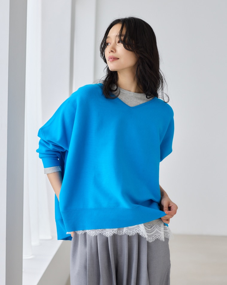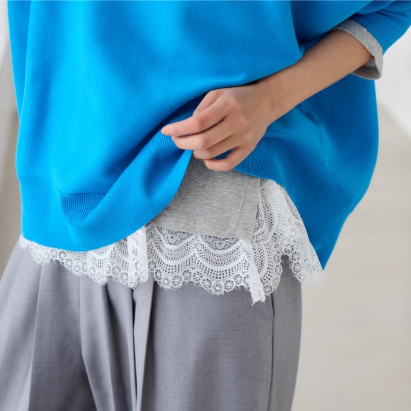 爽やかなライトブルーのニットとグレーのアイテムは好相性。シンプルでクールなコーデに、今シーズンはレーストップスのレイヤードで一気にトレンドのスタイルに。甘過ぎないレースロンTは自然な抜け感をプラスしてくれて、シンプルトップスをさり気なく華やかに。