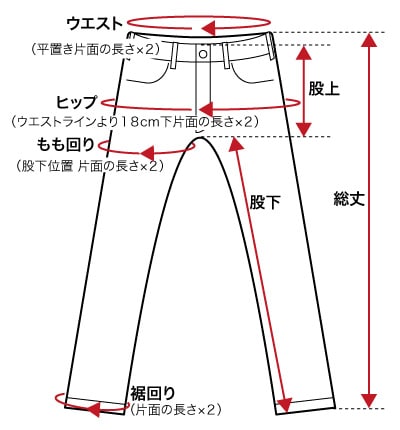 サイズ 裾回り 総丈 股上 股下 ウエスト ヒップ もも回り 2(S) 44 98.5 34.5 66 68 94 63 3(M) 100 35 68 71 97 64 46