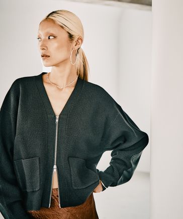 【HEREIAM】フロントジップが新鮮。レザーパッチニットカーディガン