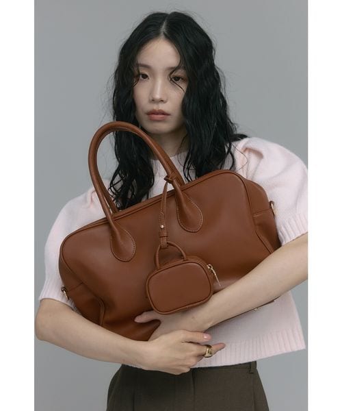 【牛革】ミニバッグチャーム付きスクエアボストンバッグ
