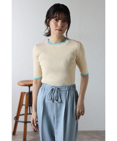 配色デザイン五分袖リブニット