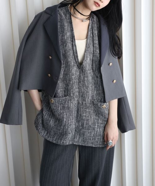 【ツイードポケット金釦ベスト】Vネックベスト オールシーズン着用可能