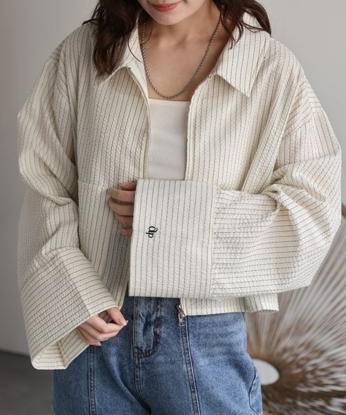 クロップド丈ダブルZIPストライプサッカーシャツ