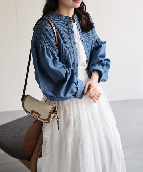 【India Fabric】ピンタックデニム シャツブルゾン / ショート丈・バンドカラー