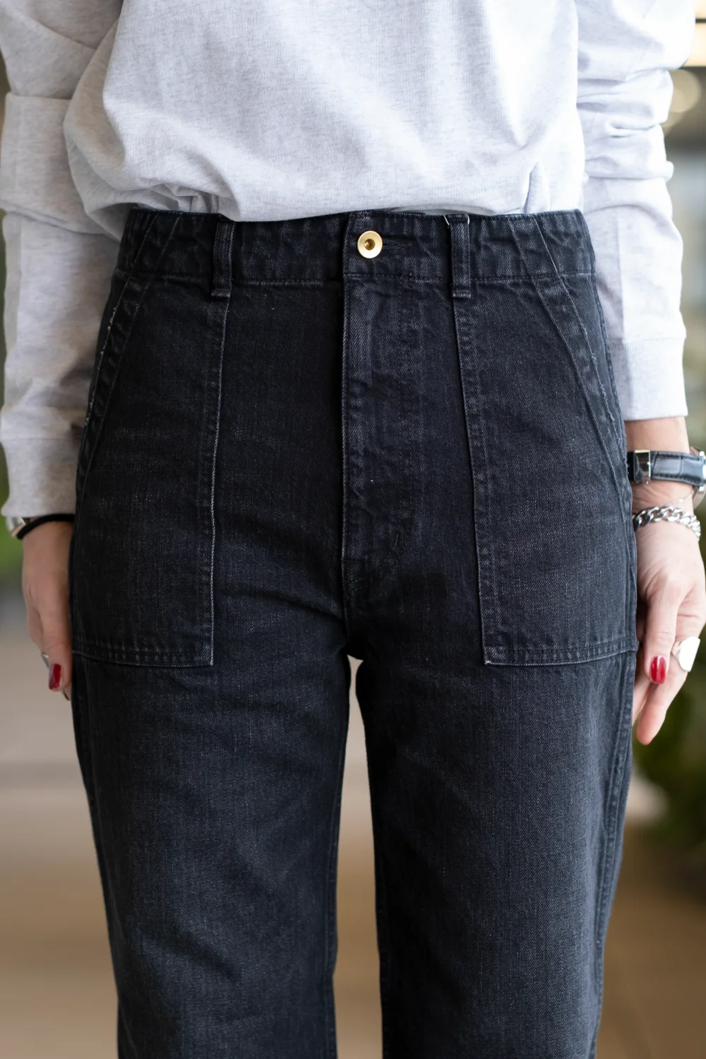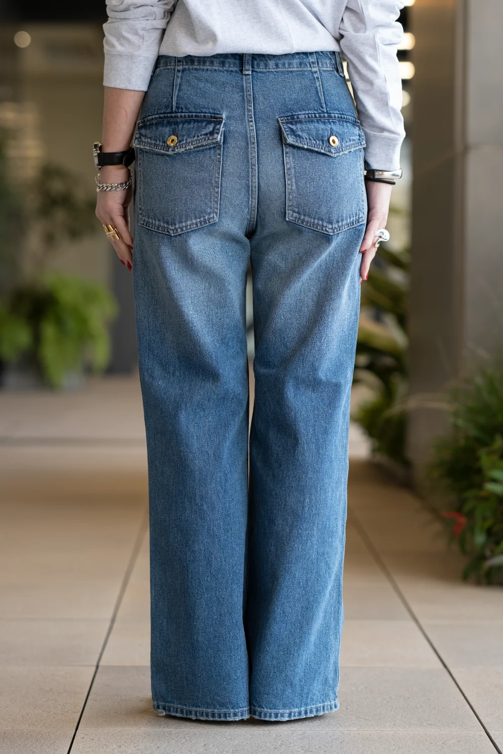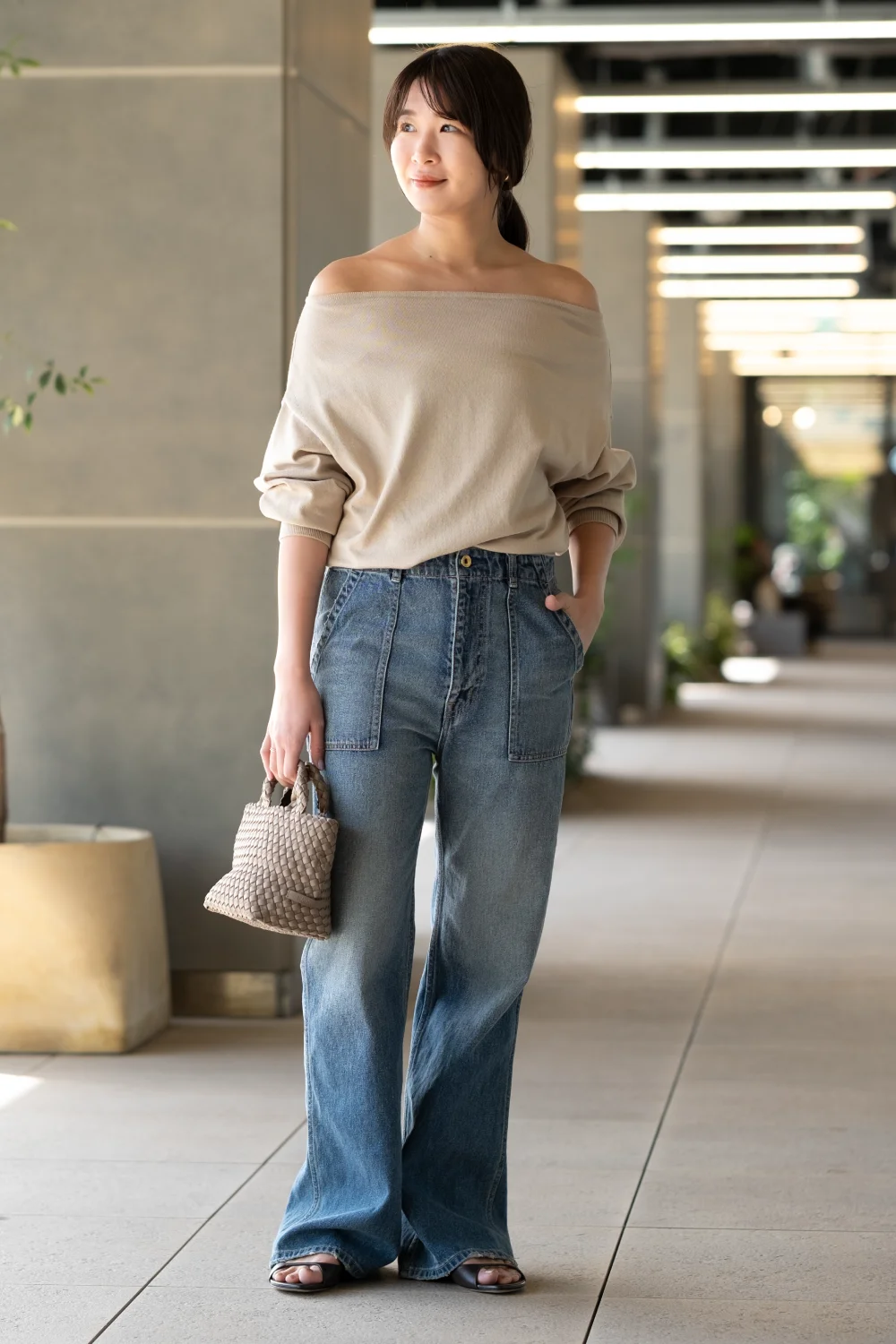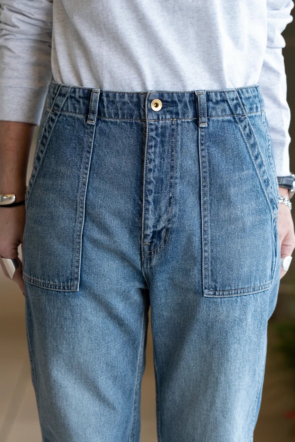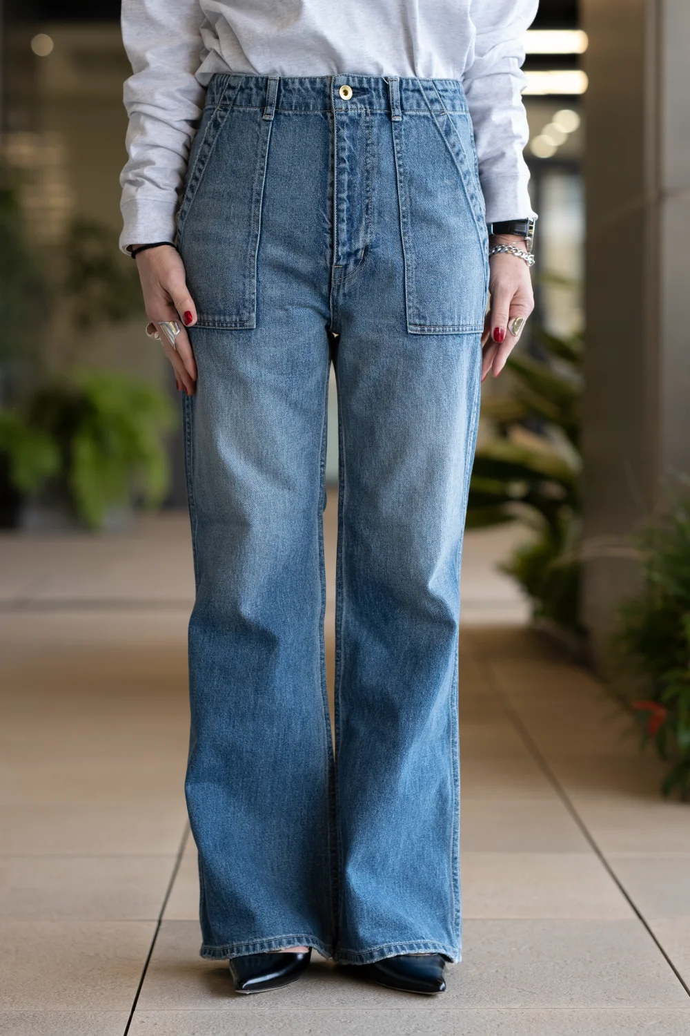 11OZのデニム生地使用。オープンエンド紡績機でつくられた糸を使用した生地は、空気を含みガサ感のあるのが特徴です。60~70年代に多く見られた素材感で、経年変化を比較的早く楽しんで頂ける素材です。デザインはベイカーパンツのデイテールを施した、セミフレアーシルエットデニム。ヒップから腰まわりをスッキリタイトに仕上げております。