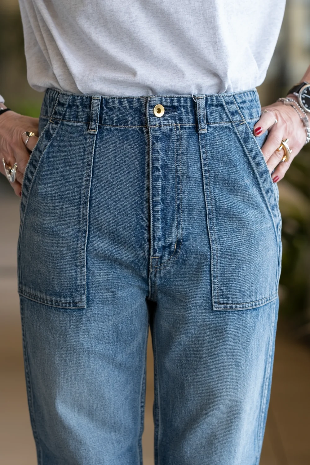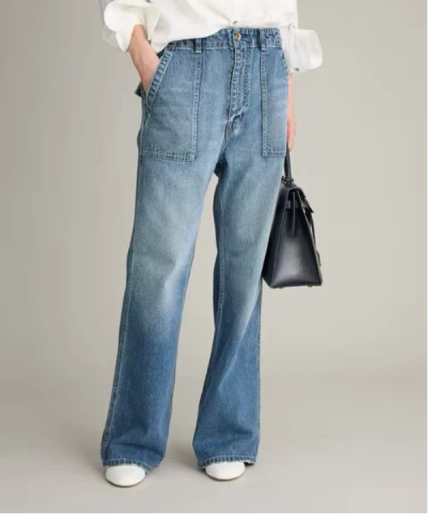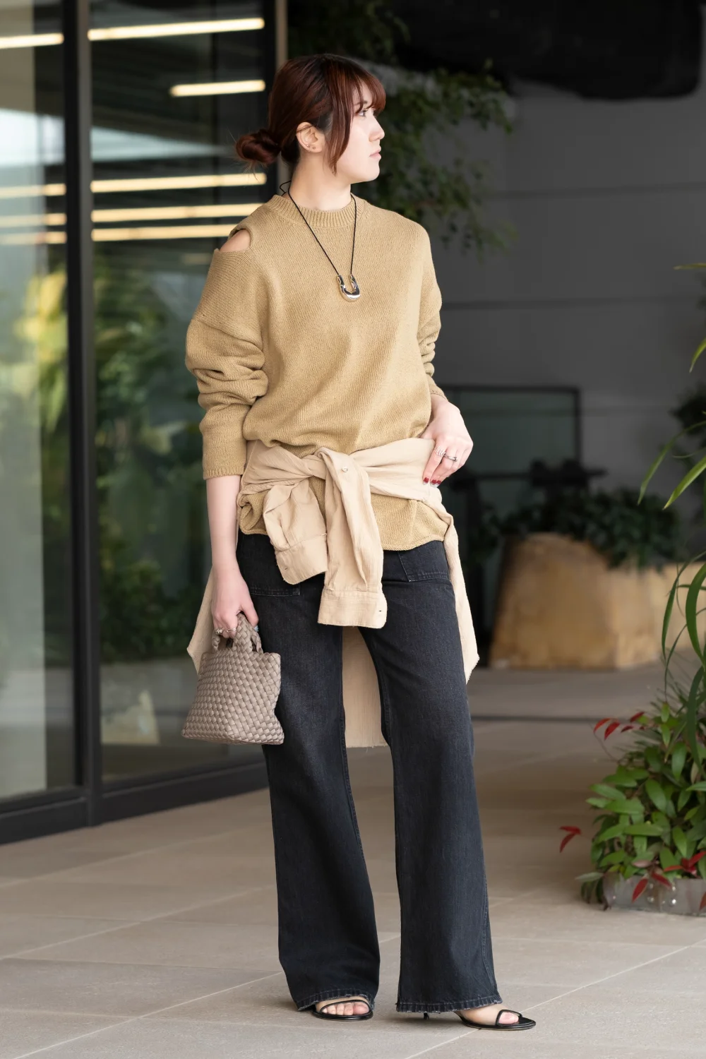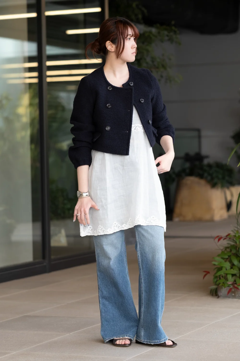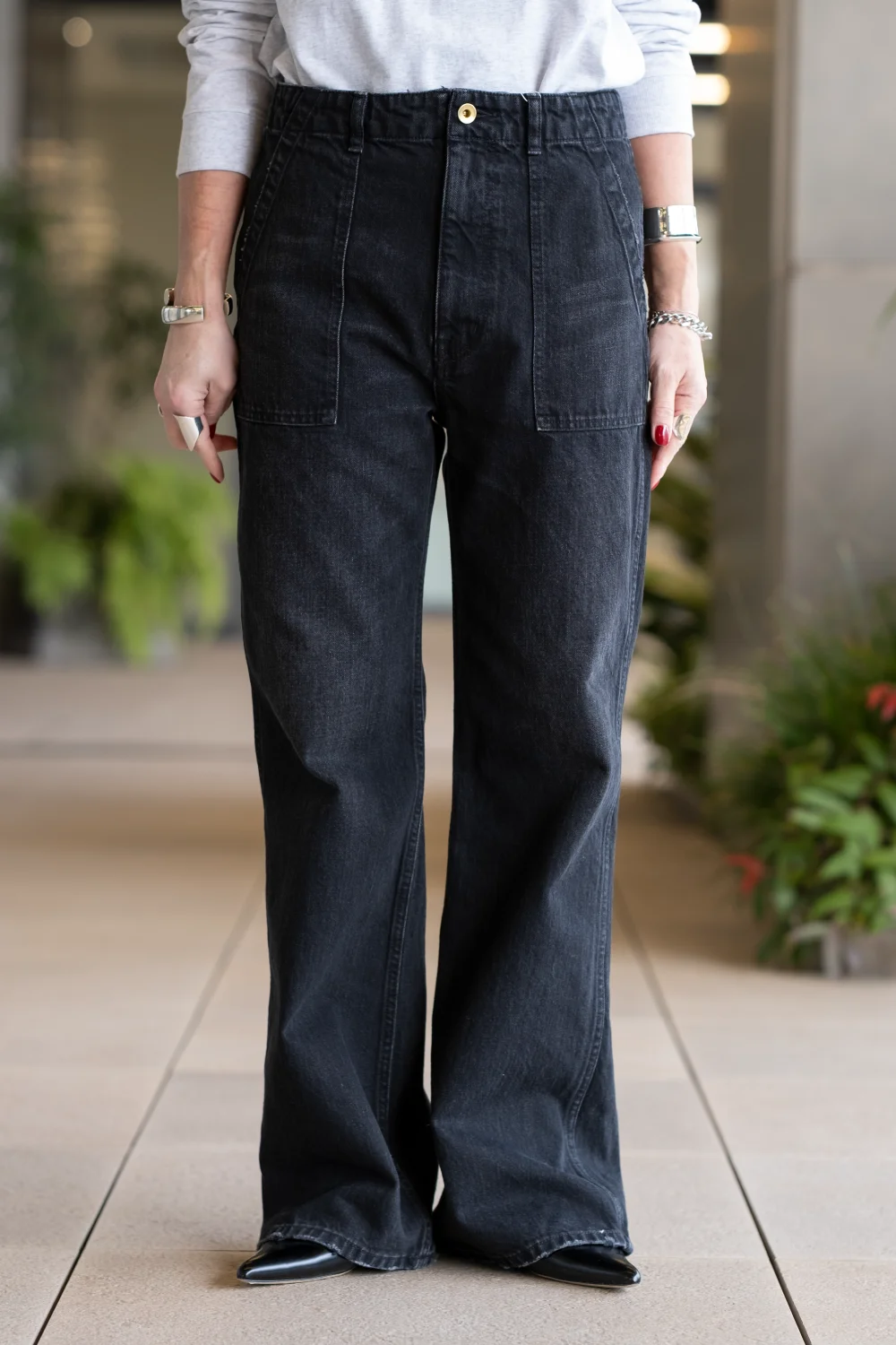 11OZのデニム生地使用。オープンエンド紡績機でつくられた糸を使用した生地は、空気を含みガサ感のあるのが特徴です。60~70年代に多く見られた素材感で、経年変化を比較的早く楽しんで頂ける素材です。デザインはベイカーパンツのデイテールを施した、セミフレアーシルエットデニム。ヒップから腰まわりをスッキリタイトに仕上げております。
