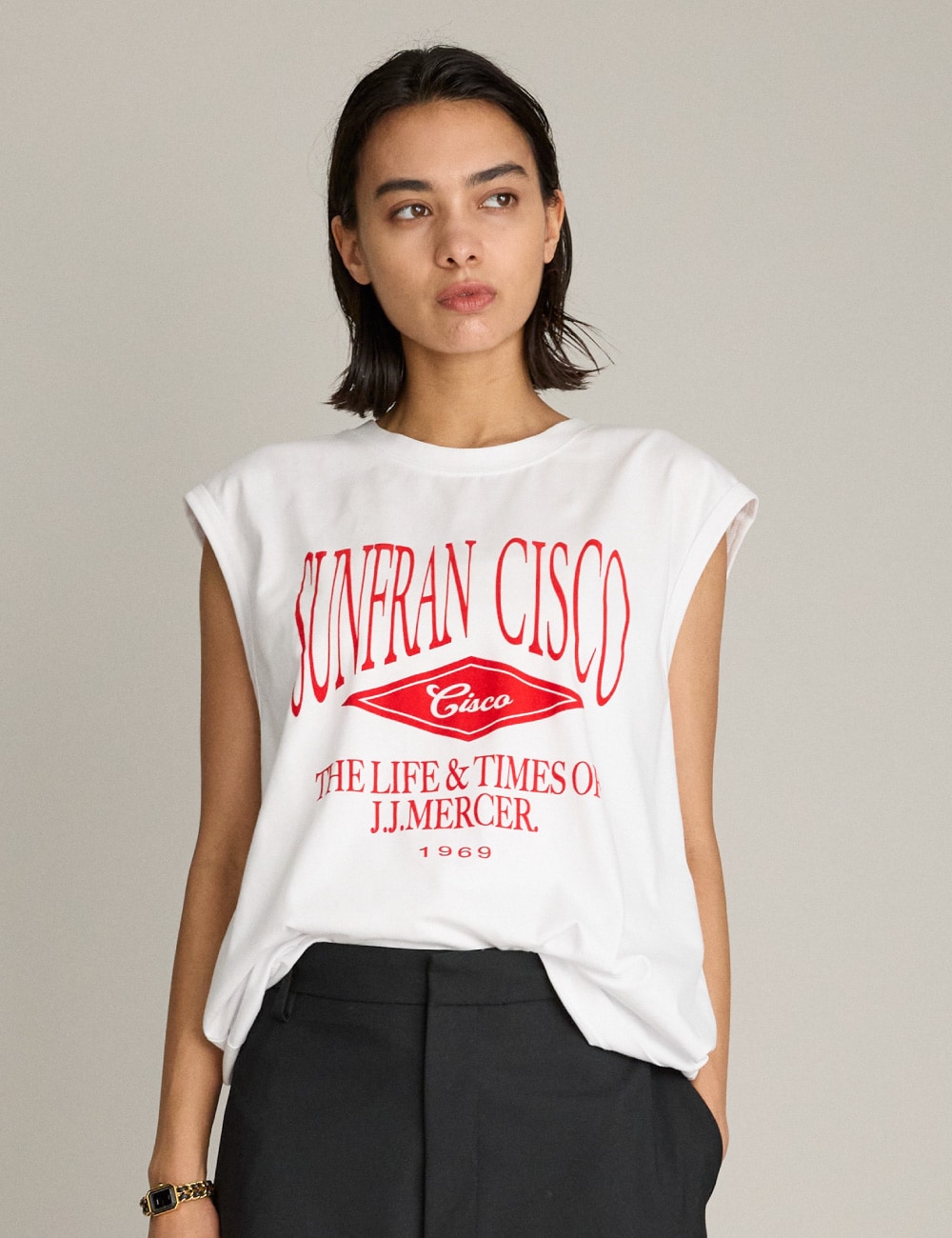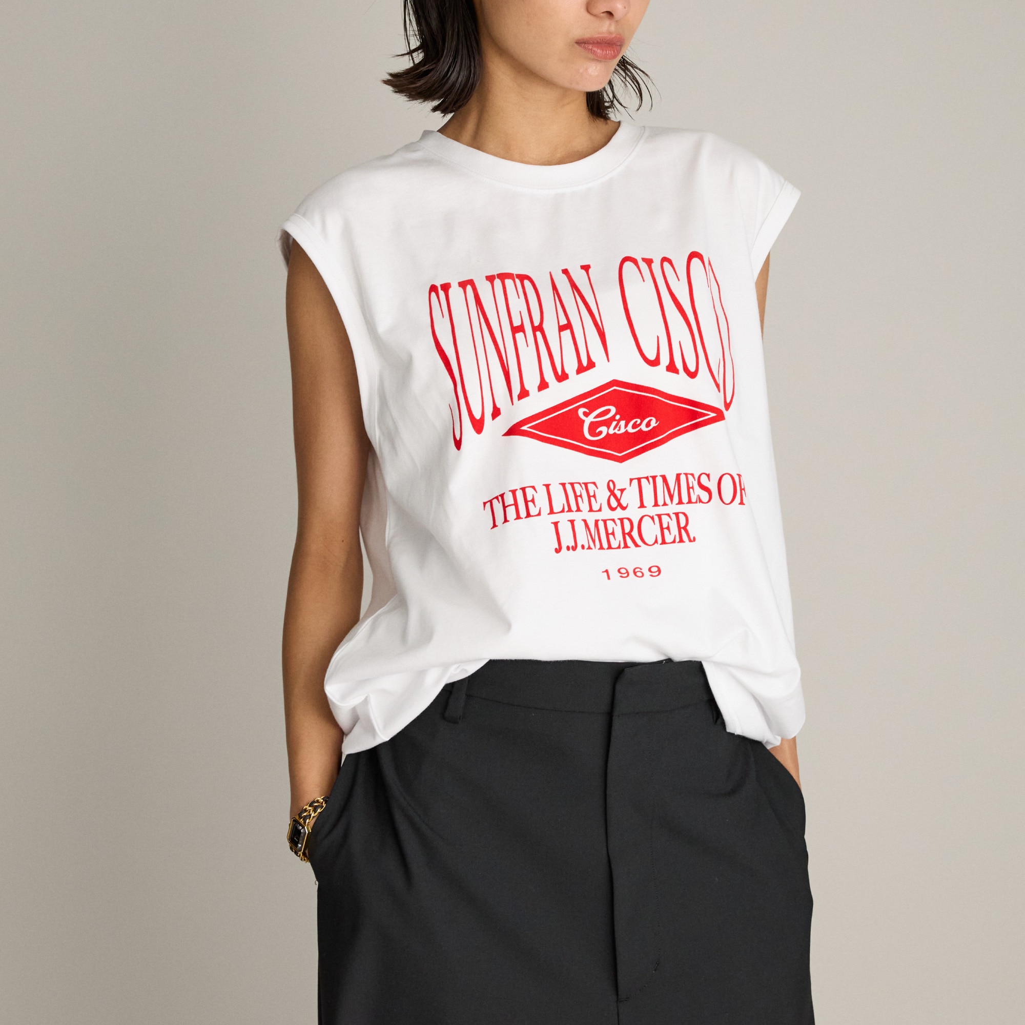 肩周りを綺麗に見せる、スッキリしたデザイン。サラッとした素材感で肌に心地よく暑い季節には一枚で涼しげに。インナーとしても使える、季節を問わず楽しめるアイテムです。ロゴのプリントがアクセントになり、シンプルな着こなしにも自然に馴染ます。着回しやすいのに、さりげなくスタイルを引き締めてくれる一枚です。