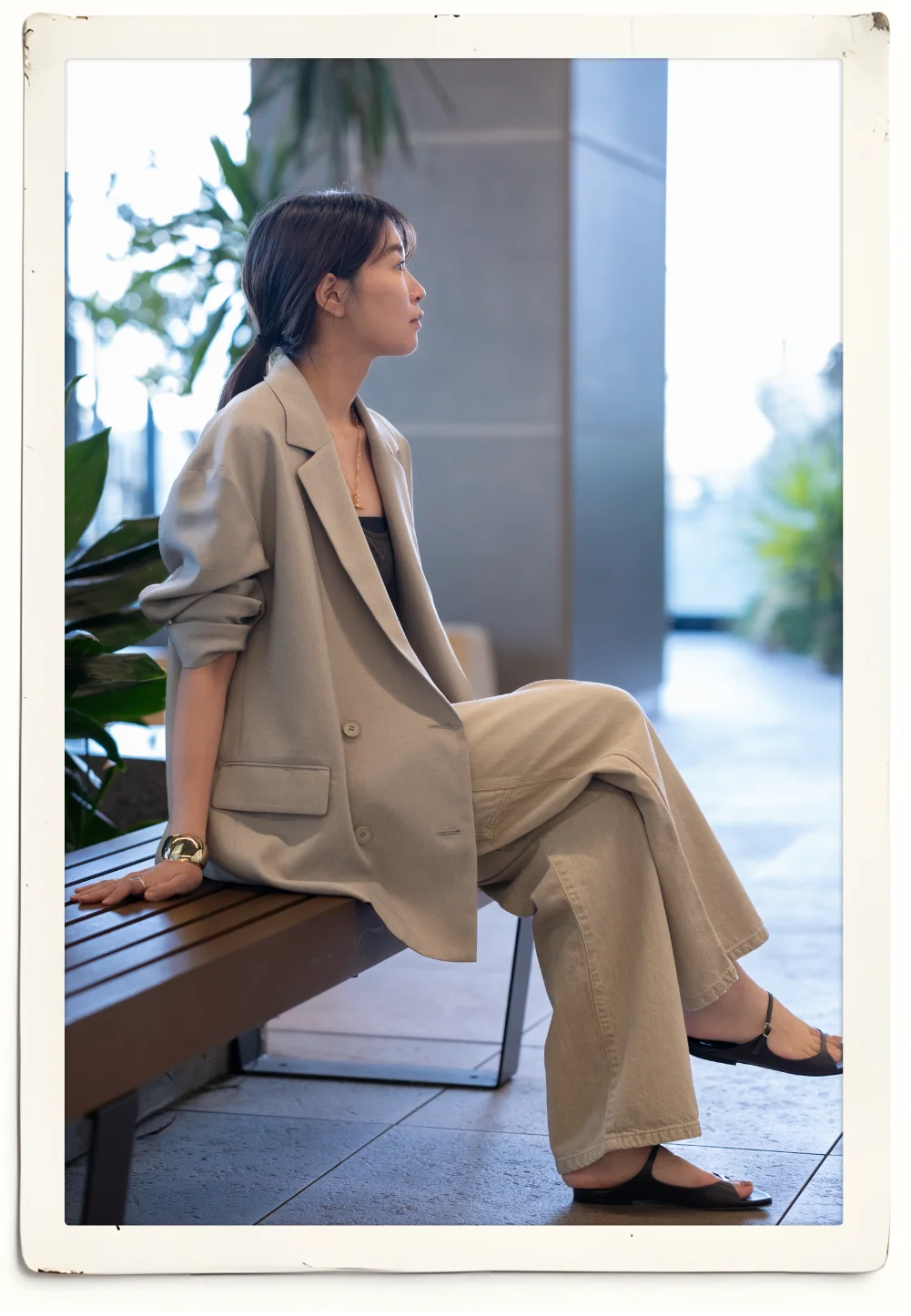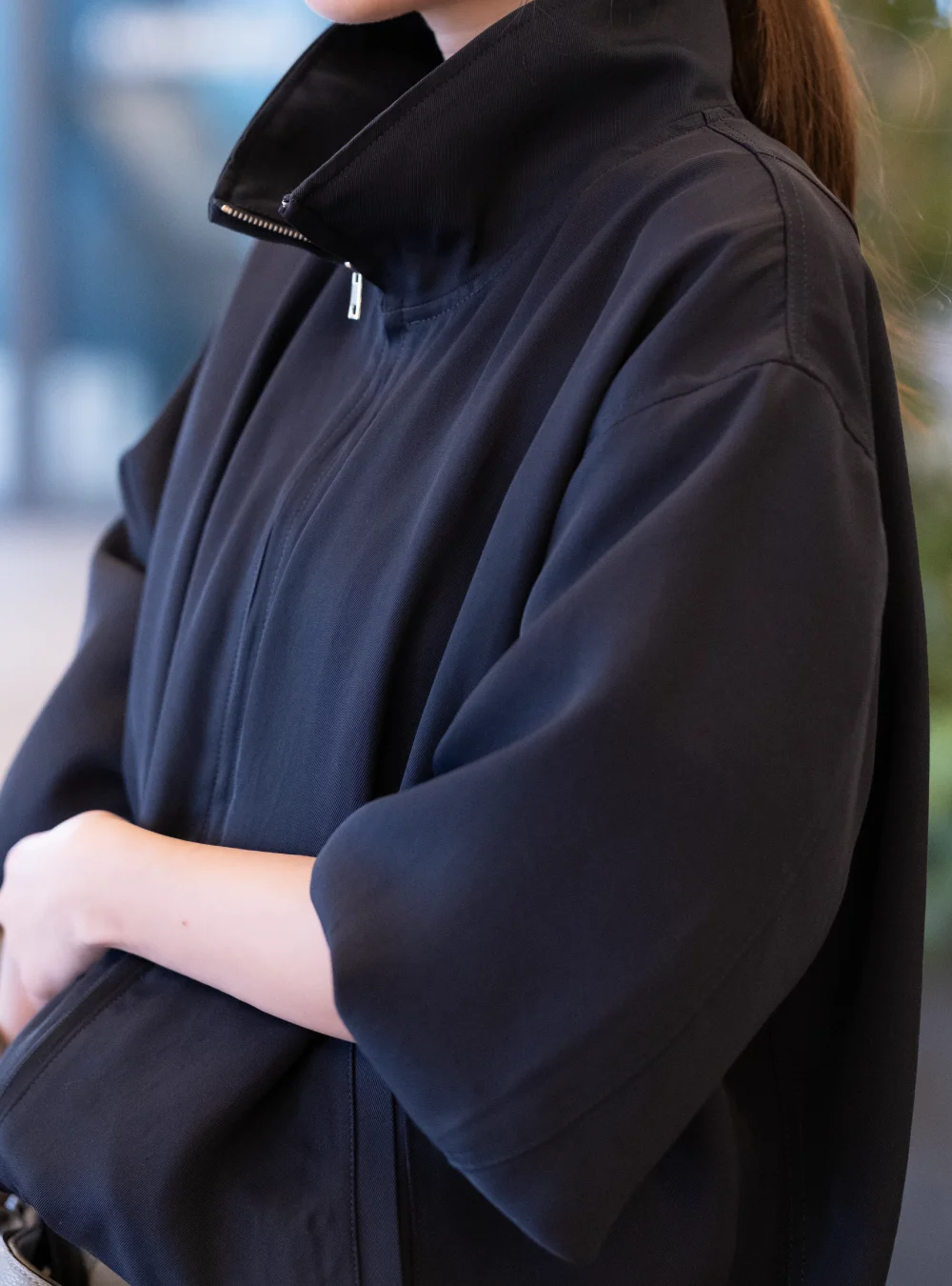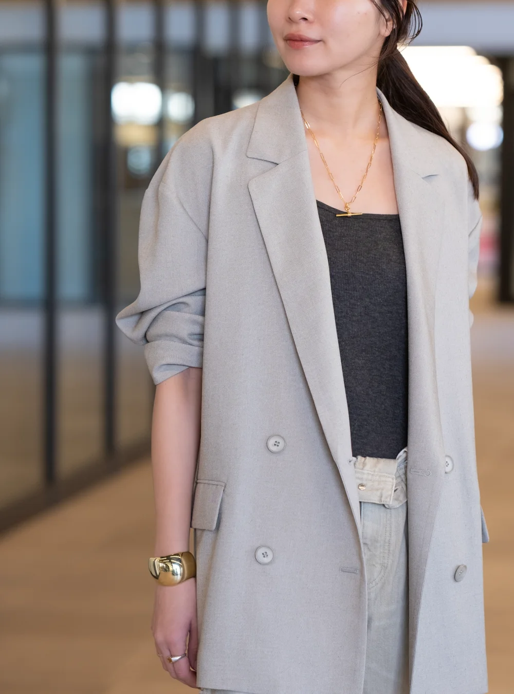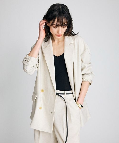 肌に馴染むニュアンスカラーをラフに羽織る贅沢。身体を包み込む計算されたボリュームシルエットは、着ていることを忘れるほどライトな質感。気負わないのに品がある、大人のための最旬カジュアルを体現。襟を立てボリュームを出し、ワイドデニムで重心を下げた、ハンサムなスタイリングに。