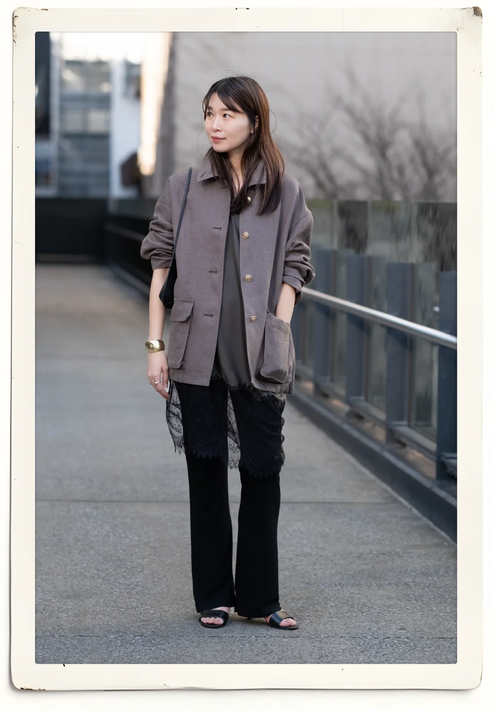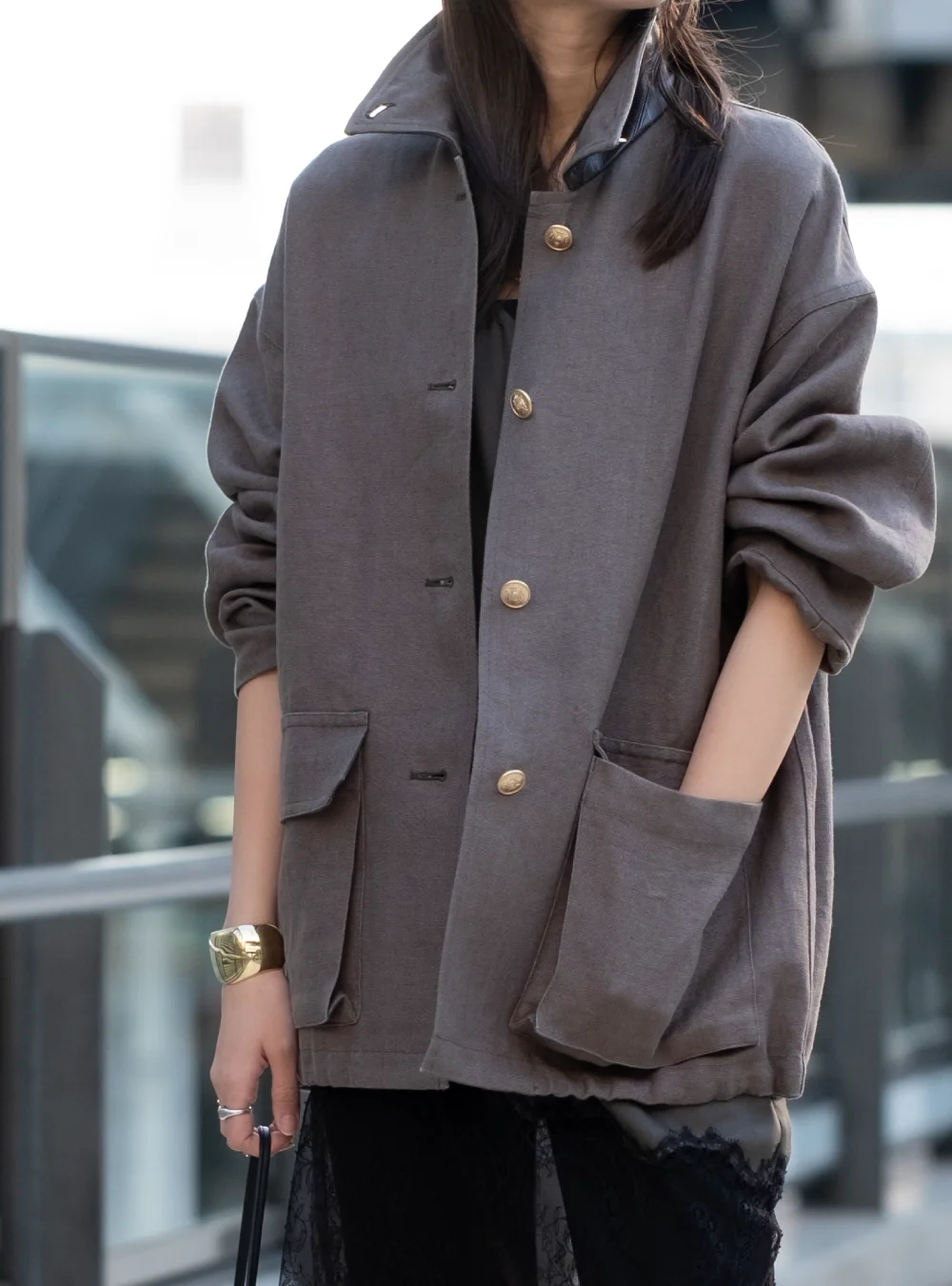 肌にさらりと馴染むヘンプの清涼感が、忙しい日常に心地よい余裕を。バサッと羽織れるボリュームを、ニュアンスのある中間色と計算されたシルエットで都会的にアップデート。袖を通すたびに馴染む、素材の豊かな表情を愉しむ今期イチオシのアウターです。裾からのぞくレースの透け感と、アクセサリーいらずの金ボタンが、程よいきちんと感をプラス。ラフな休日の装いを、ぐっと品良く、大人っぽく仕上げます。