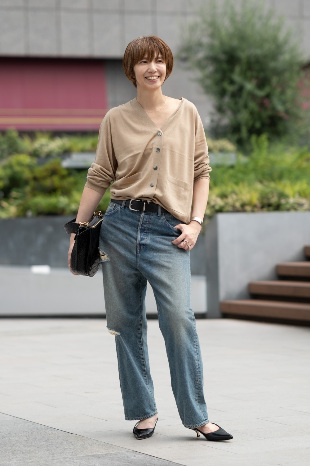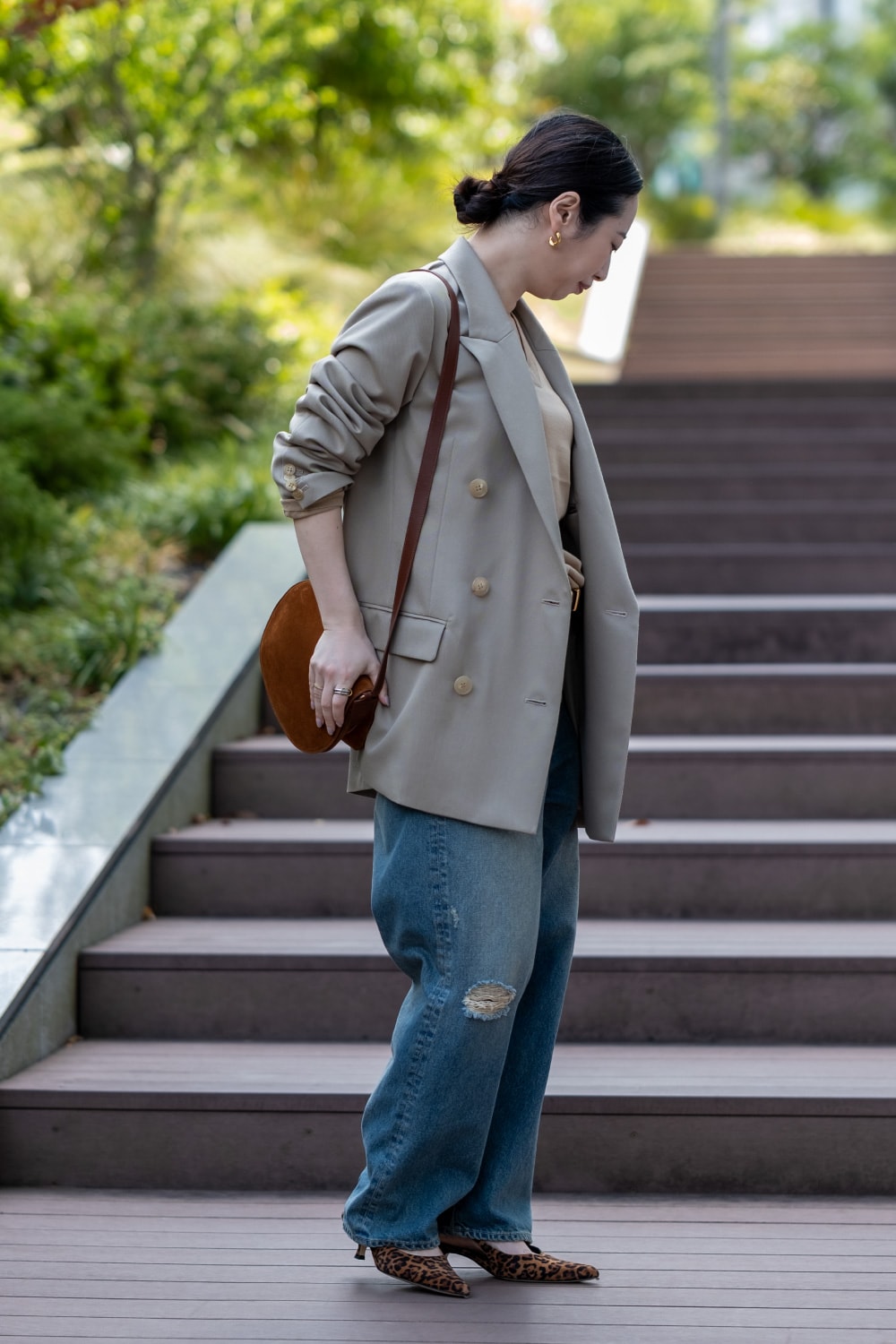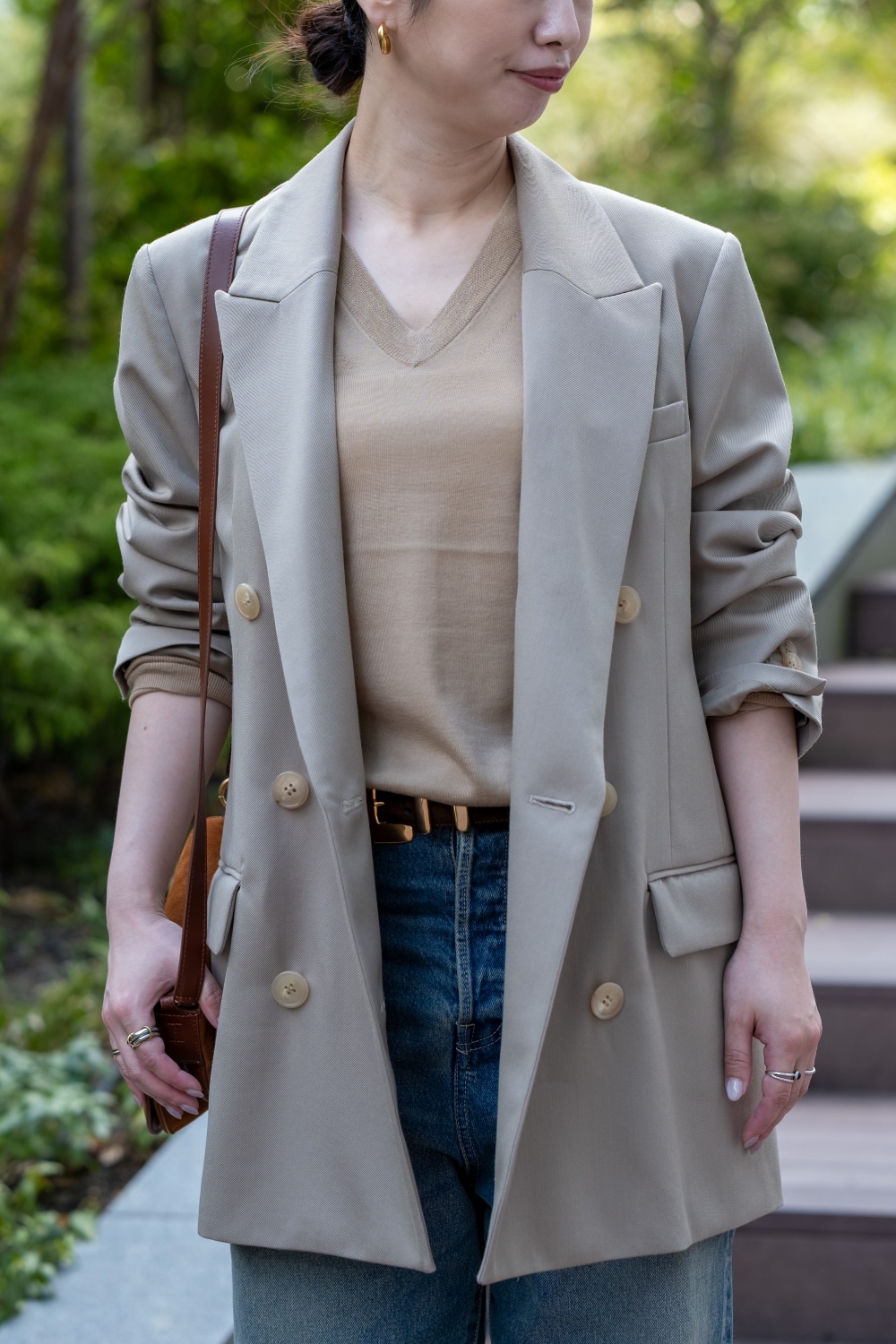 オーバーサイズ気味のジャケットをさらっと羽織って、こなれ感をプラス。インナーはシンプルなベージュニットで柔らかさを残しながら、名品のデニムでまとめたYukaのベーシックスタイル。一見メンズライクな組み合わせでも、女性らしいニュアンスを添える小物使いでハードになりすぎず、クリーンに仕上がるのがYukaらしさですね。