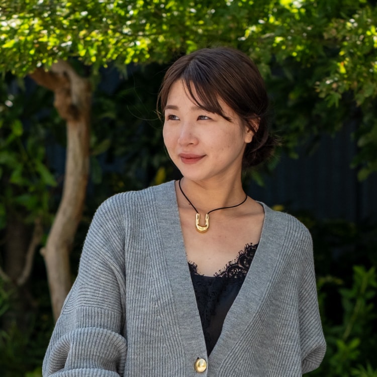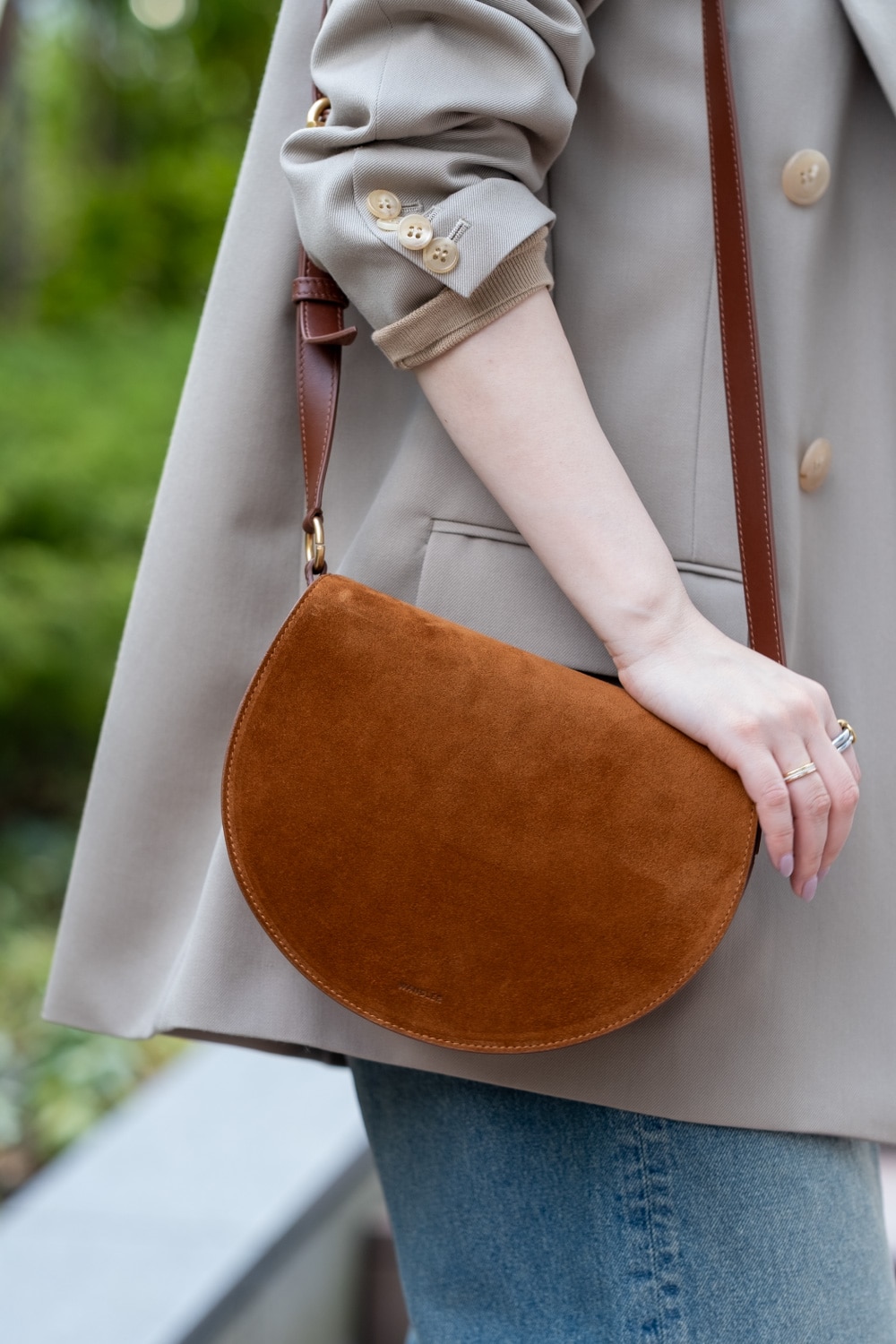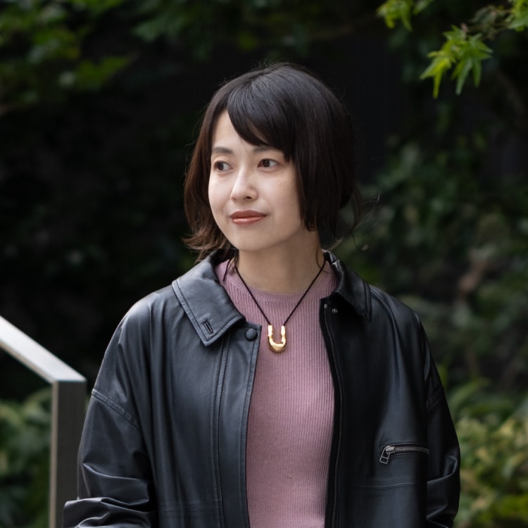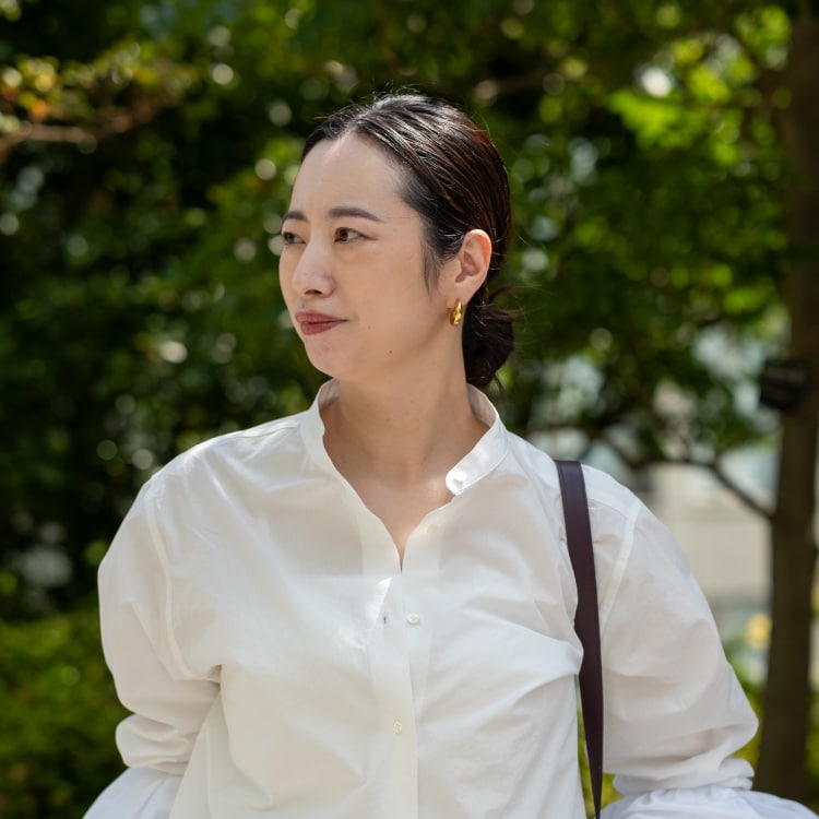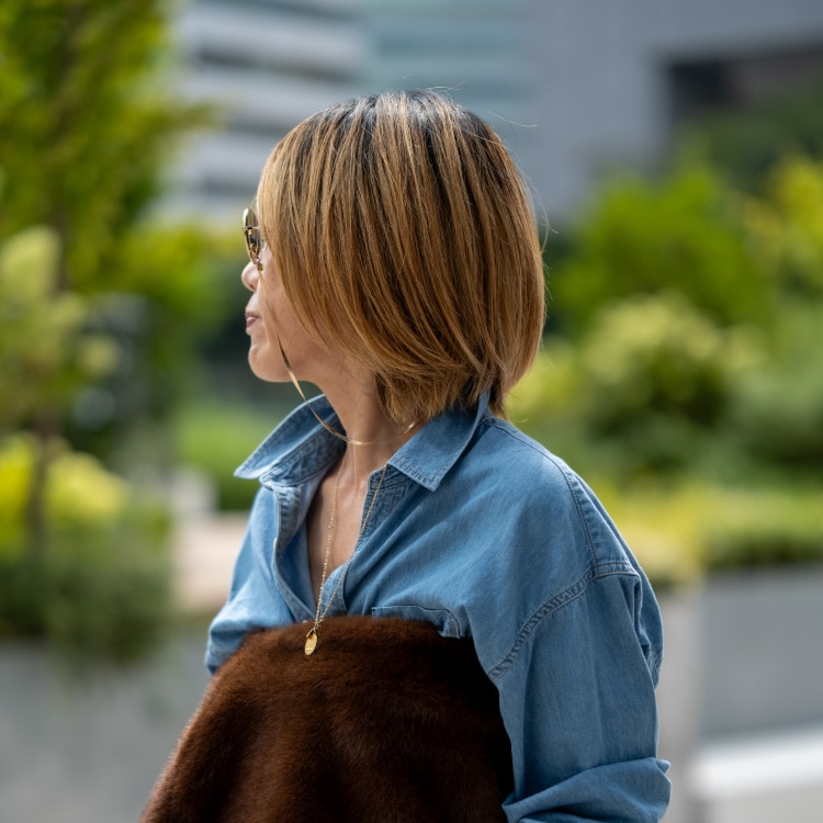 オーバーサイズ気味のジャケットをさらっと羽織って、こなれ感をプラス。インナーはシンプルなベージュニットで柔らかさを残しながら、名品のデニムでまとめたYukaのベーシックスタイル。一見メンズライクな組み合わせでも、女性らしいニュアンスを添える小物使いでハードになりすぎず、クリーンに仕上がるのがYukaらしさですね。
