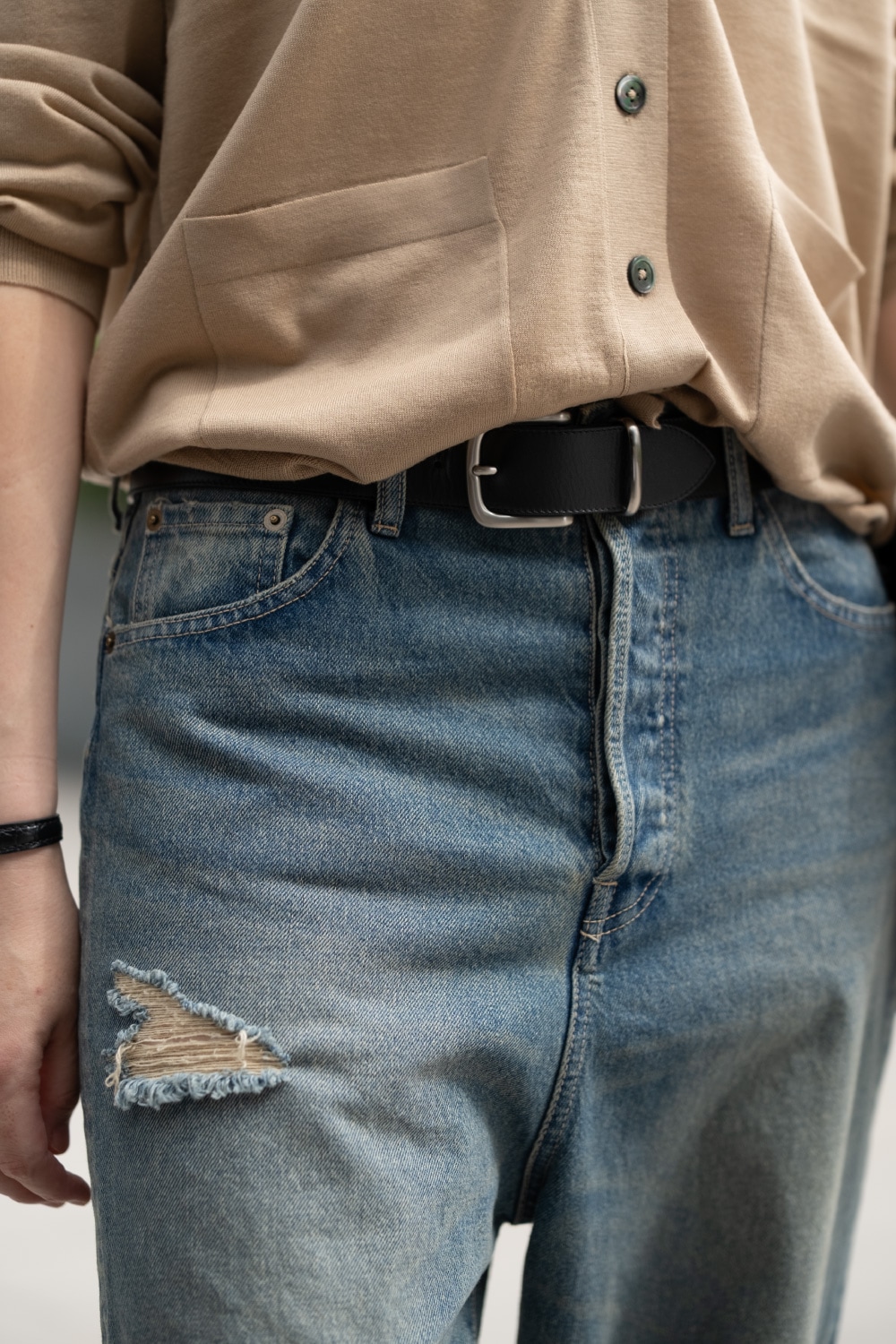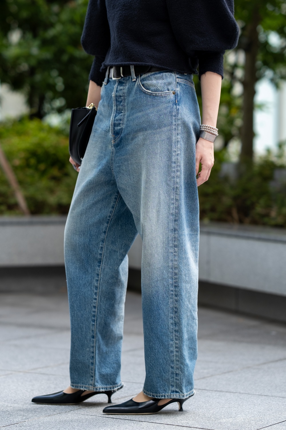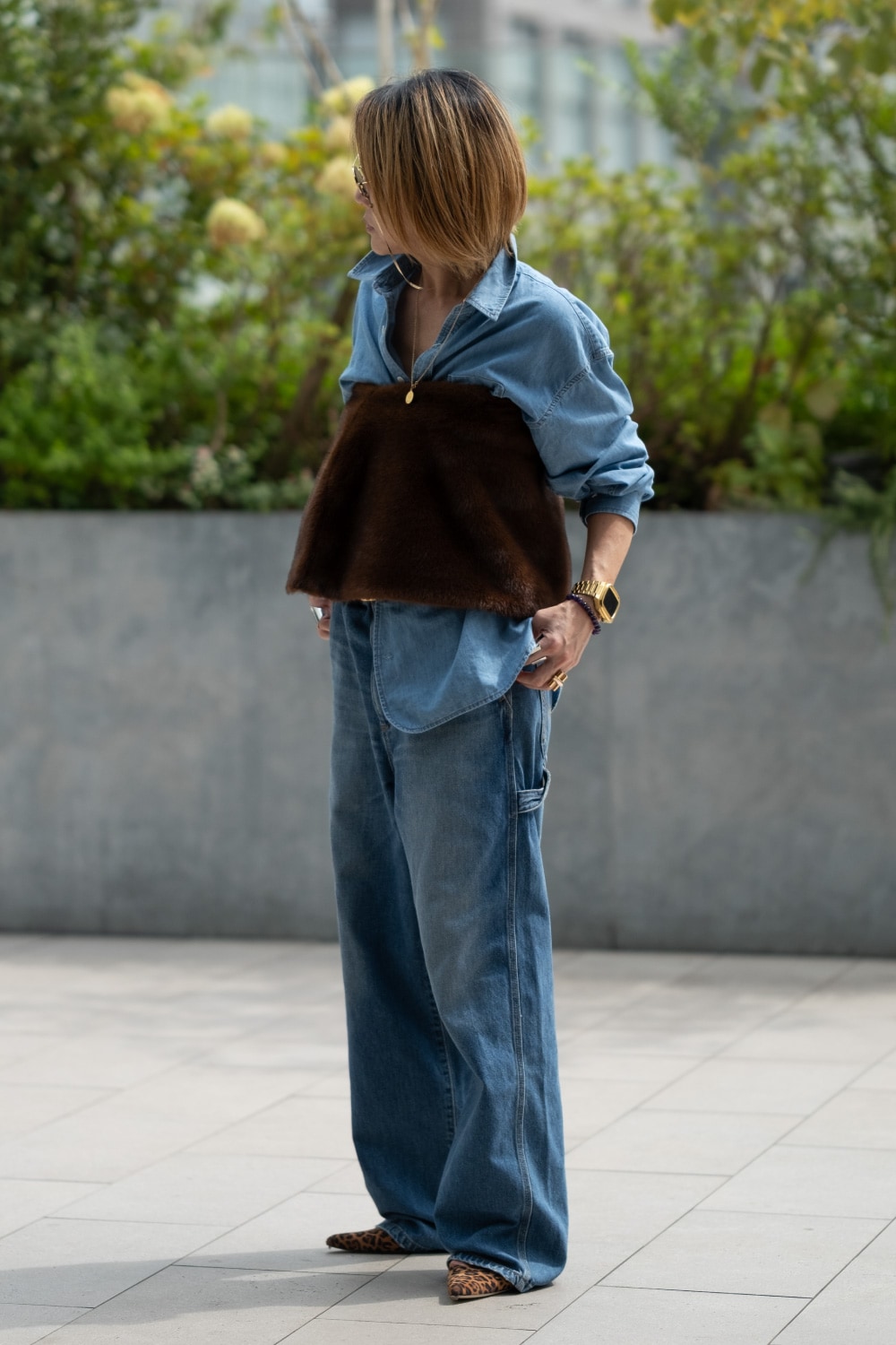 大好きなスタイリングのひとつでもあるデニムオンデニム。ワークになりがちな組み合わせに、ファーを取り入れシーズンムードをひとさじプラス。本来首に巻くスヌードを、あえて胸位置にずらす。スタリングに存在感を与え、ワーク感が和らぎ、モードなスタイルにアップデート。小物は使い方次第で化ける。そんな遊び心をくすぐられるスタイリングに仕上げました。