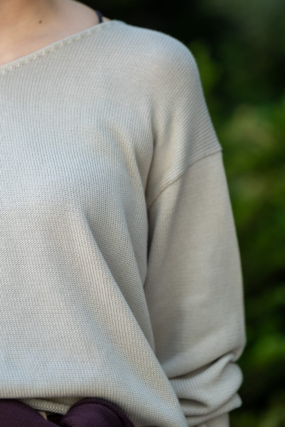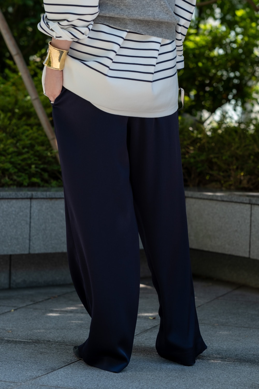 さらっと着たゆるシルエットのニットに、ワイドなベージュパンツを合わせたワントーンスタイル。一見シンプルなのに、よく見ると腰に巻いたのは…実は同じニットのお色違い~!"同型2色持ち"というさりげないオシャレ技で、スタイリングに奥行きをプラス。そして小技も忘れず、ベルトとパンプスで引き締め、リラックス感の中にも、きちんと感が漂います。2色買いして正解!」と言わんばかりの大物ぶり。頼もしい~!